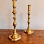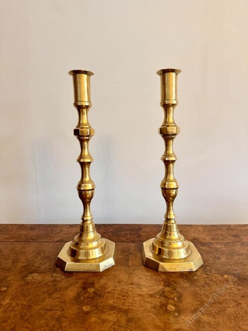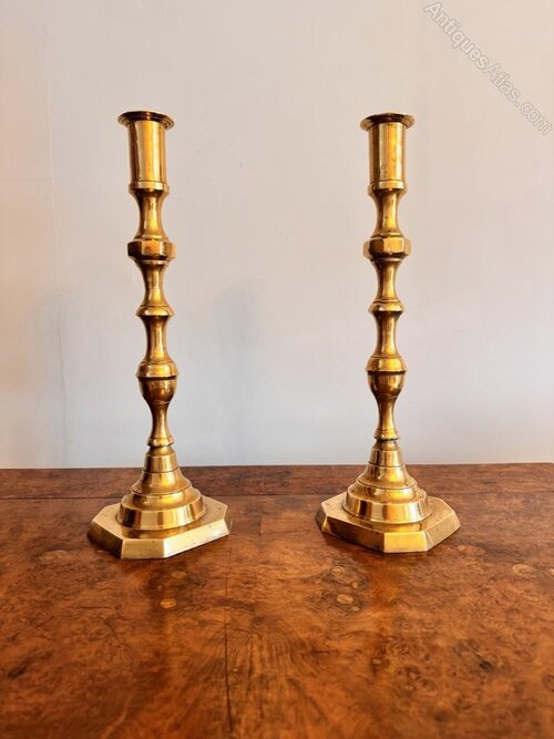 Quality pair of large antique Victorian brass candlesticks, having a quality pair of brass candlesticks with circular shaped drip trays above a turned shaped column raised on a square shaped base.H 43cm