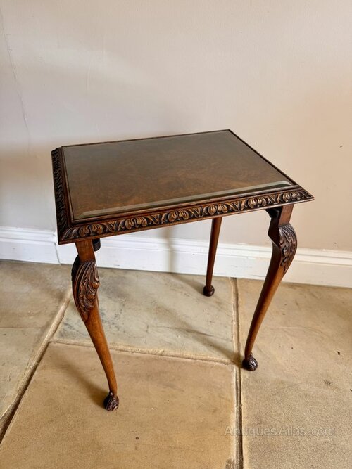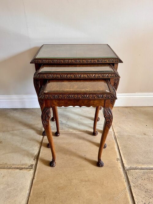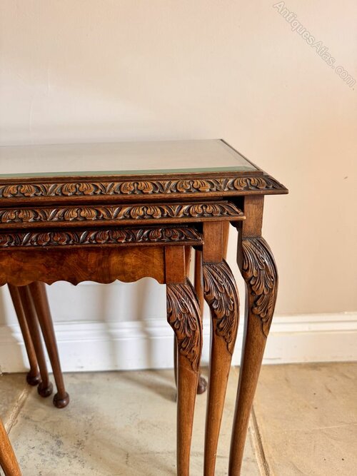Outstanding quality antique walnut nest of three tables, having outstanding quality walnut rectangular shaped tops with a carved border surrounding a glass top, standing on carved solid walnut shaped legs with carved feet.Beautifully crafted and designed displaying fantastic colour, the three tables have removable glass tops.