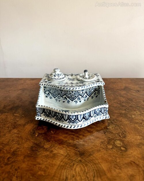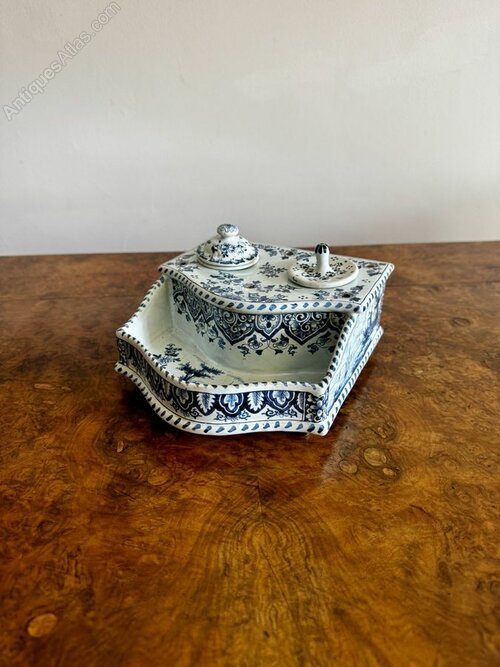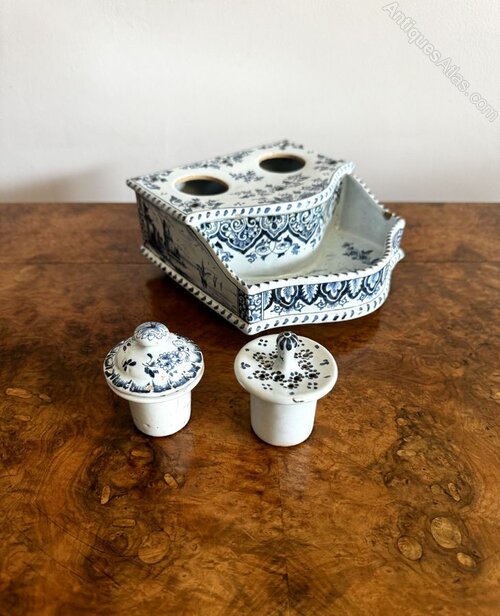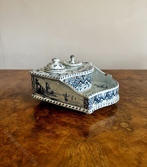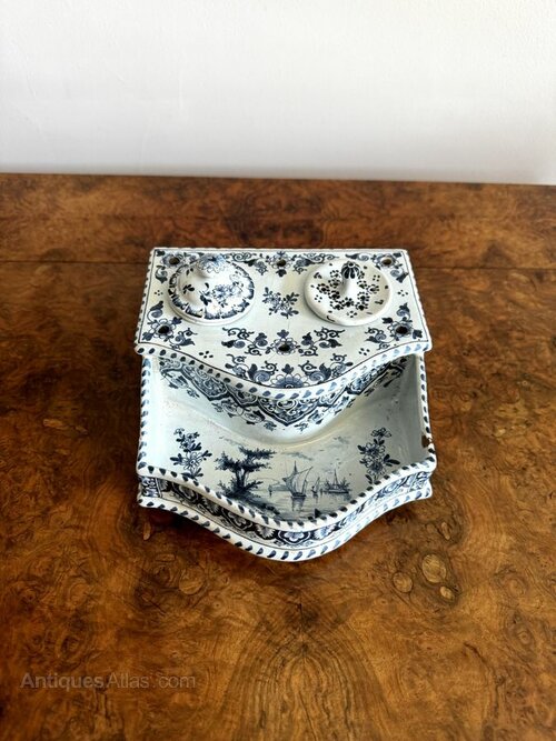 Lovely quality antique Dutch Delft inkstand, having a quality antique Delft inkstand with a shaped tray to the base above is the original removable ink well and pen stand, hand painted in beautiful blue & white colours with marine scenes and floral detail throughout.Small chip to the corner as shown.