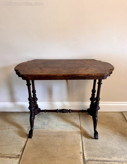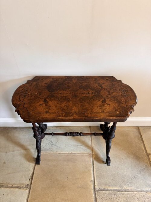 Quality antique Victorian burr walnut occasional table, having a quality antique Victorian occasional table with a burr walnut shaped top with inlaid decoration, on carved frame raised on the original castors.H 74cm