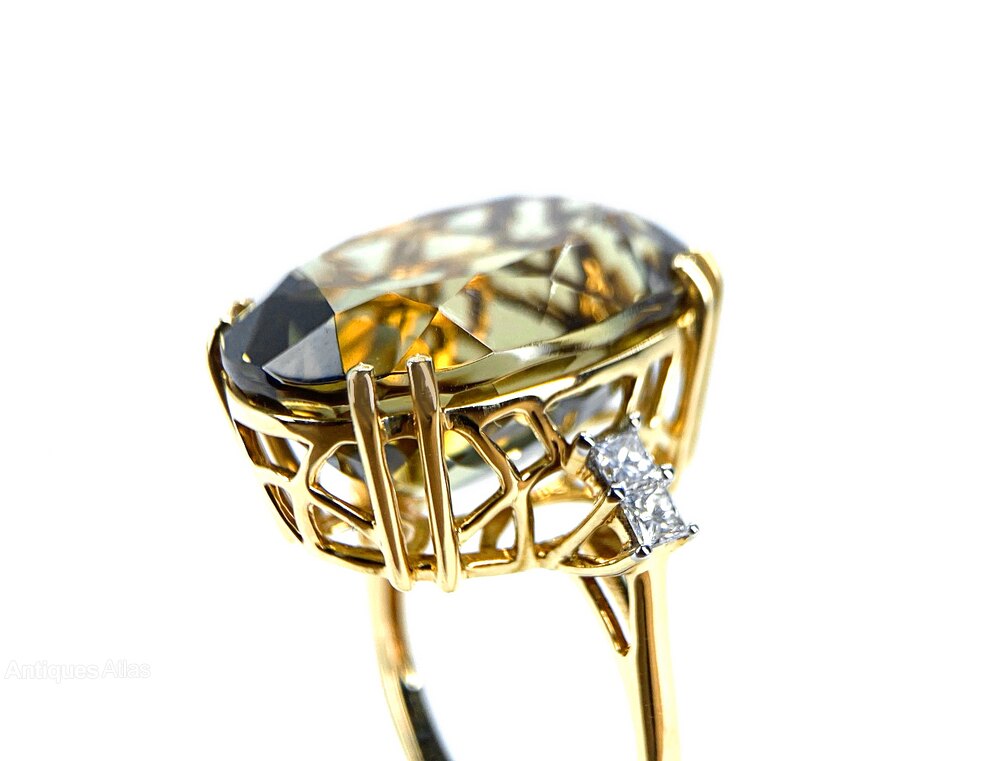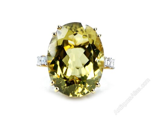 This smart ring has an beautifully facetted oval green beryl approximately 17.50 carats with princess cut diamonds on the shoulders . 4 diamonds approximately 0.08 carats each = 0.32 carat total. All set in a beautiful 18 carat yellow gold setting The ring measures 19.79 mm x 16.98 mm across. The ring size is N 1/2 but we have a superb jeweller who can resize without a trace. Weight 0.31 grams.Date21st Century :