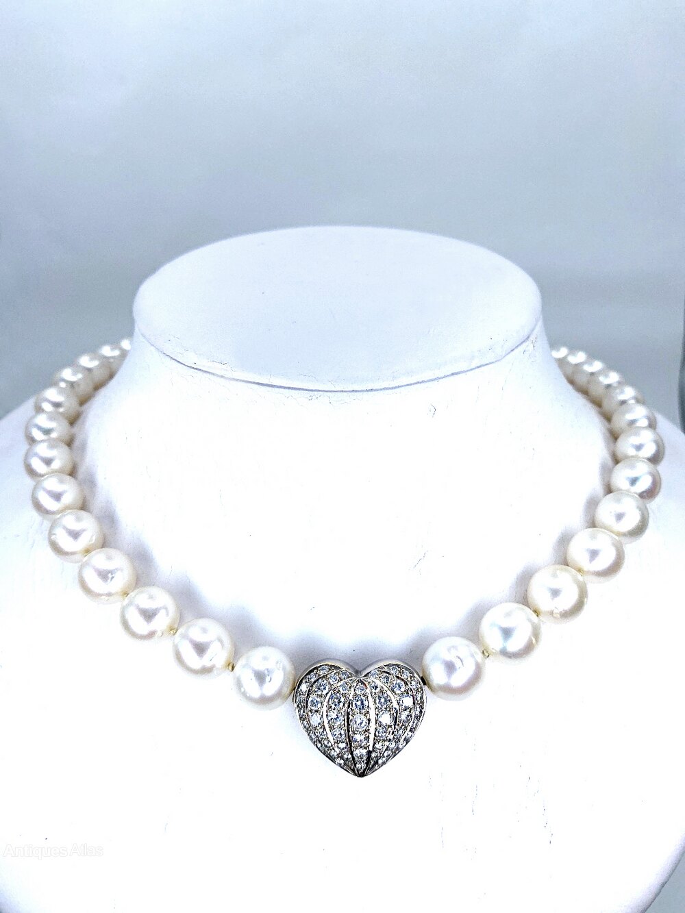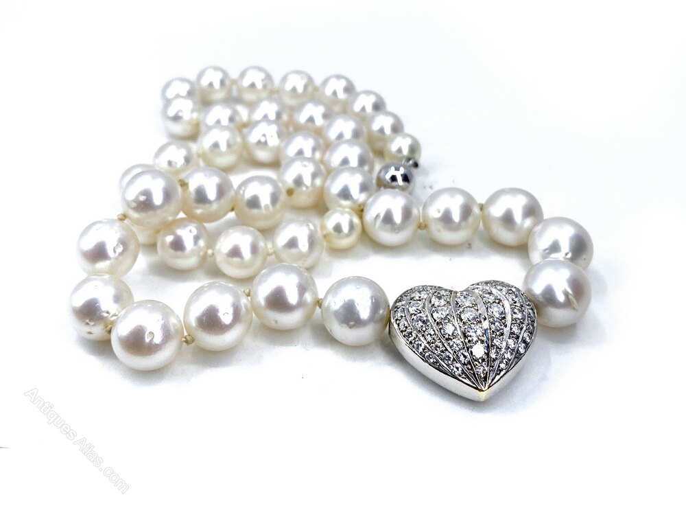 This beautiful necklace has graduated South Sea Pearls measure 9.45 Mm up to 11.00mm. The diamond heart is set with 52 brilliant cut diamonds totalling approximately 1.50 carats.All set in 18 carat white gold, The necklace measures 17 inches. ( 43 Cms) It has an 18 carat brushed white gold ball clasp Weight 64.80 Grams.Date1990s :