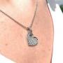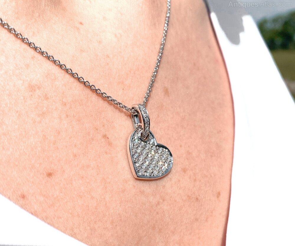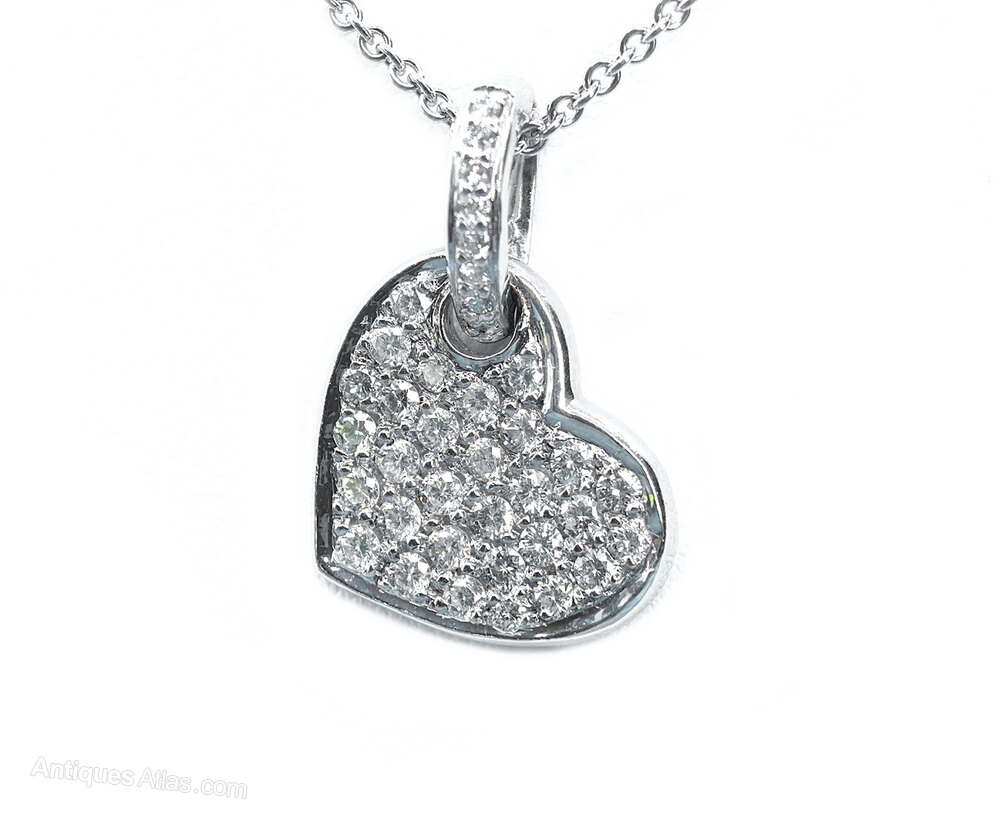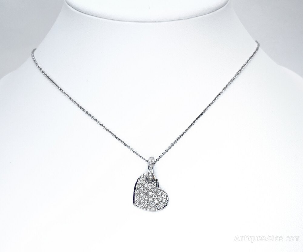This heart necklace has 38 diamonds averaging 0.03 carats each = 1.14 carats of diamonds pave set in 18 carat white gold. The heart measures 18.77 mm across x 15.14 mm. The 18 carat white gold chain is 20 inches ( 51 cms) long. Weight 11.35 grams.Date21st Century :