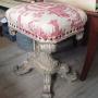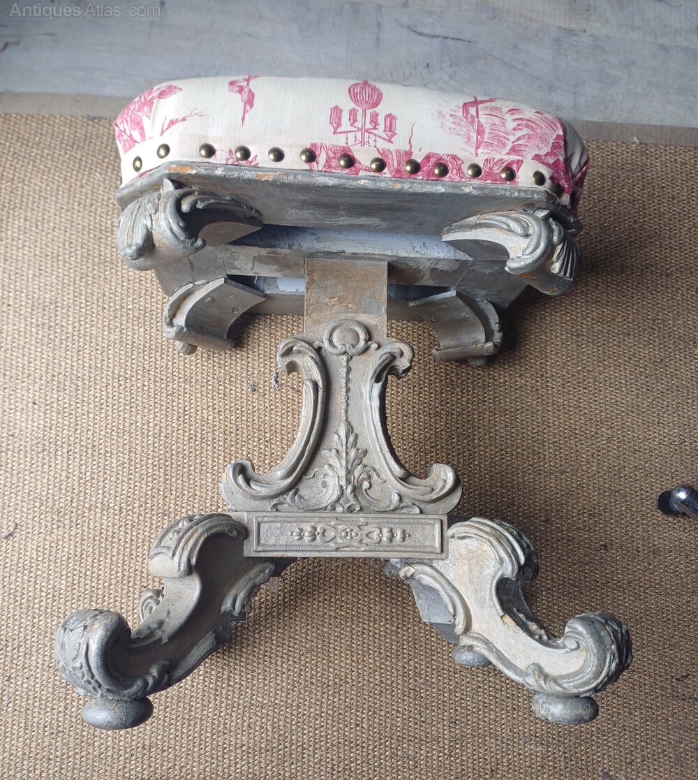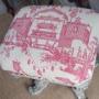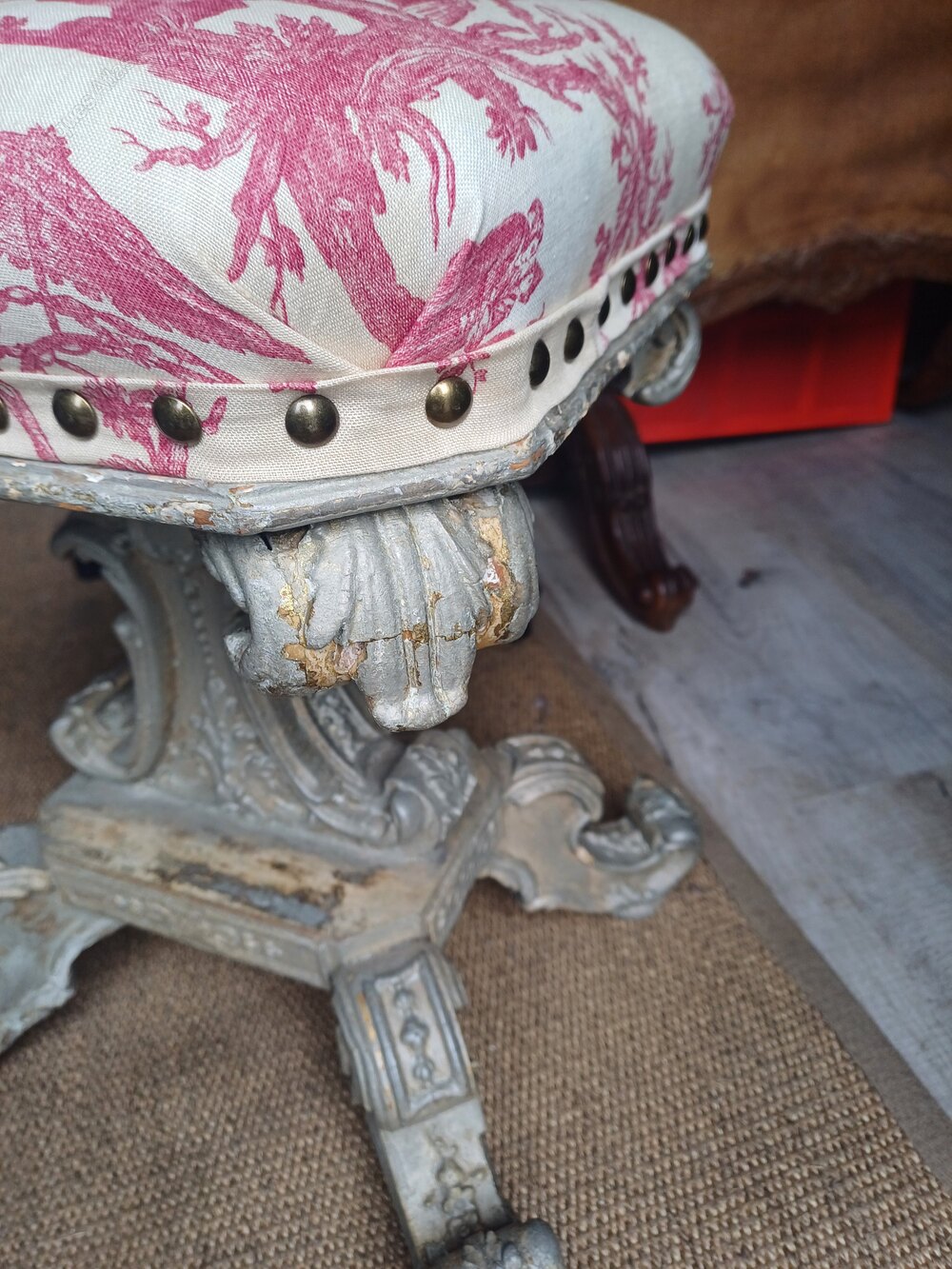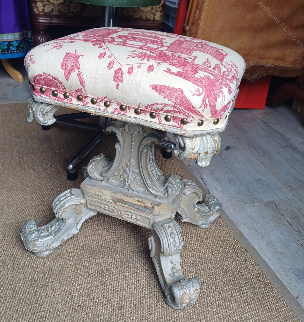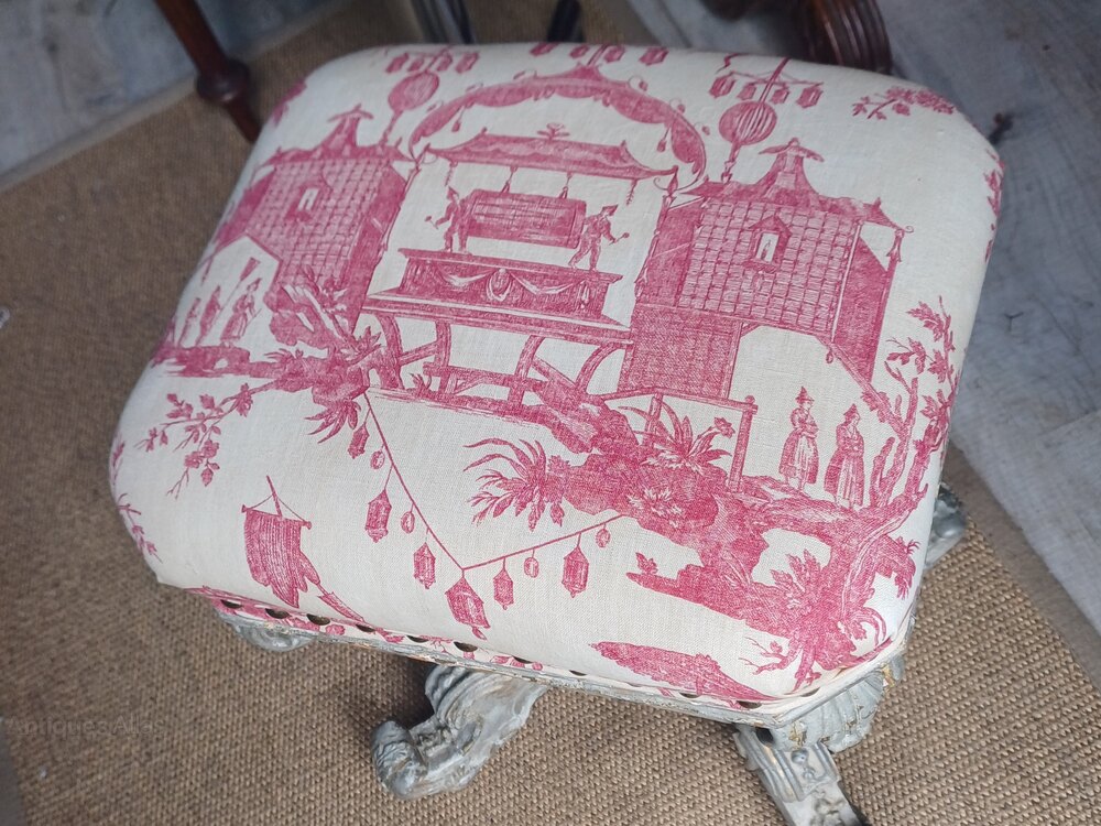 Lovely rococo distressed painted stool.Upholstered in pink/white toile de Jouay fabricDateLate 19th Century