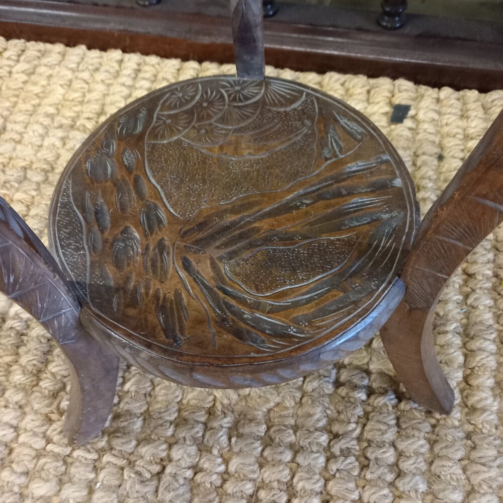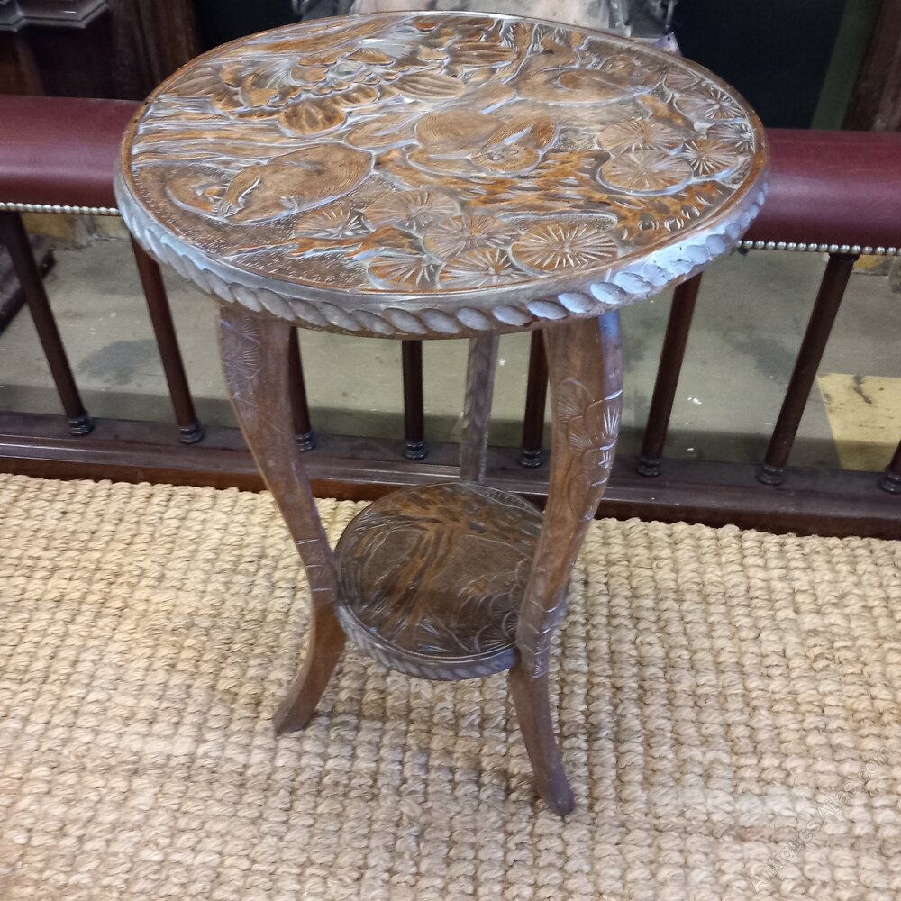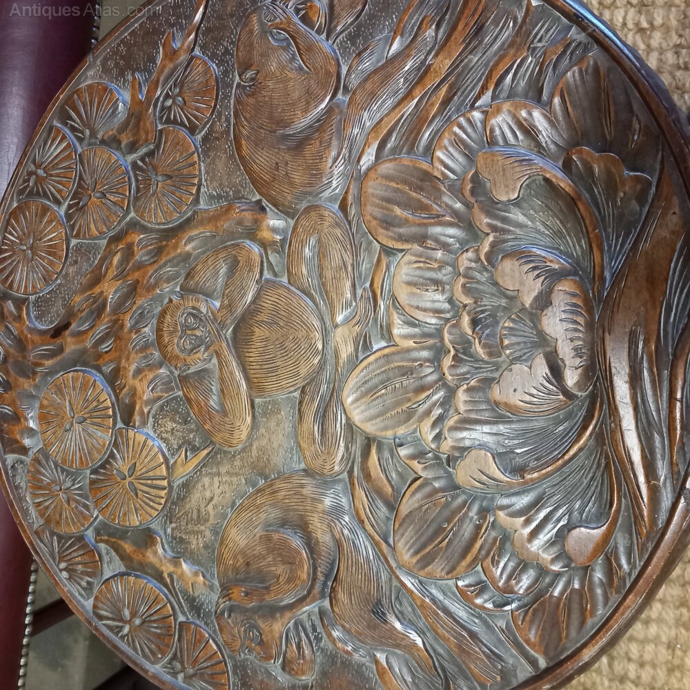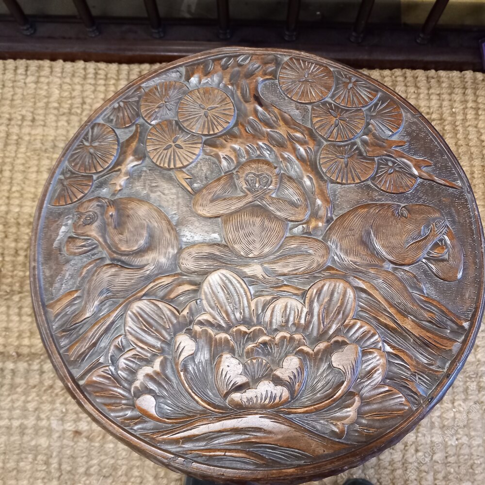 A good Arts and Crafts occasional table originally retailed by Liberty of London. This was part of Libertys exotic range. The top is well carved depicting the 'Three Wise monkeys' The table is in very good condition.Distance Selling Regulations