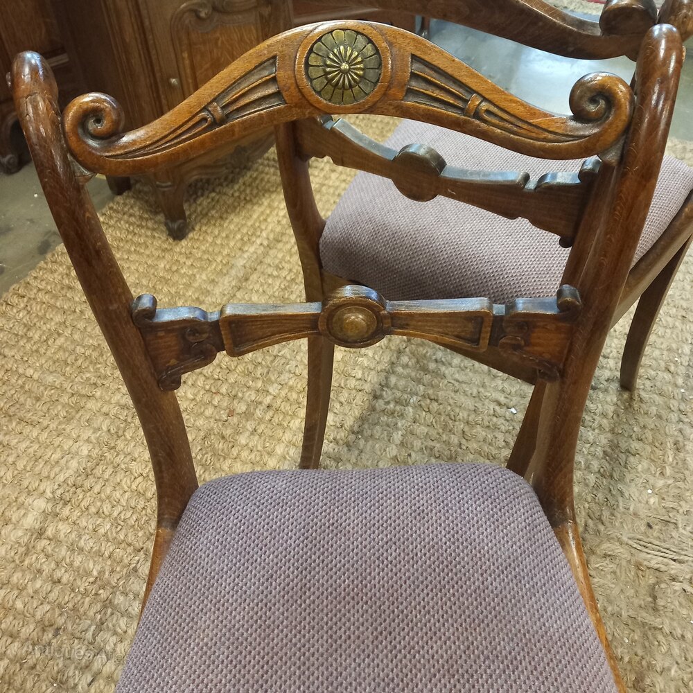 A stunning pair of English Regency chairs. These chairs are 2 of a set of 4. We have split them as the other pair are in their original polish and this pair has at some time been re polished lighter in colour. The chairs have all the elements of the regency period, Neoclassical design with Greek, Roman and Egyptian elements.These are stunning decorative chairs, they have had a long life 200 years in fact and show signs of wear and tear. never the less lovely chairs. Please ask if you require more images .