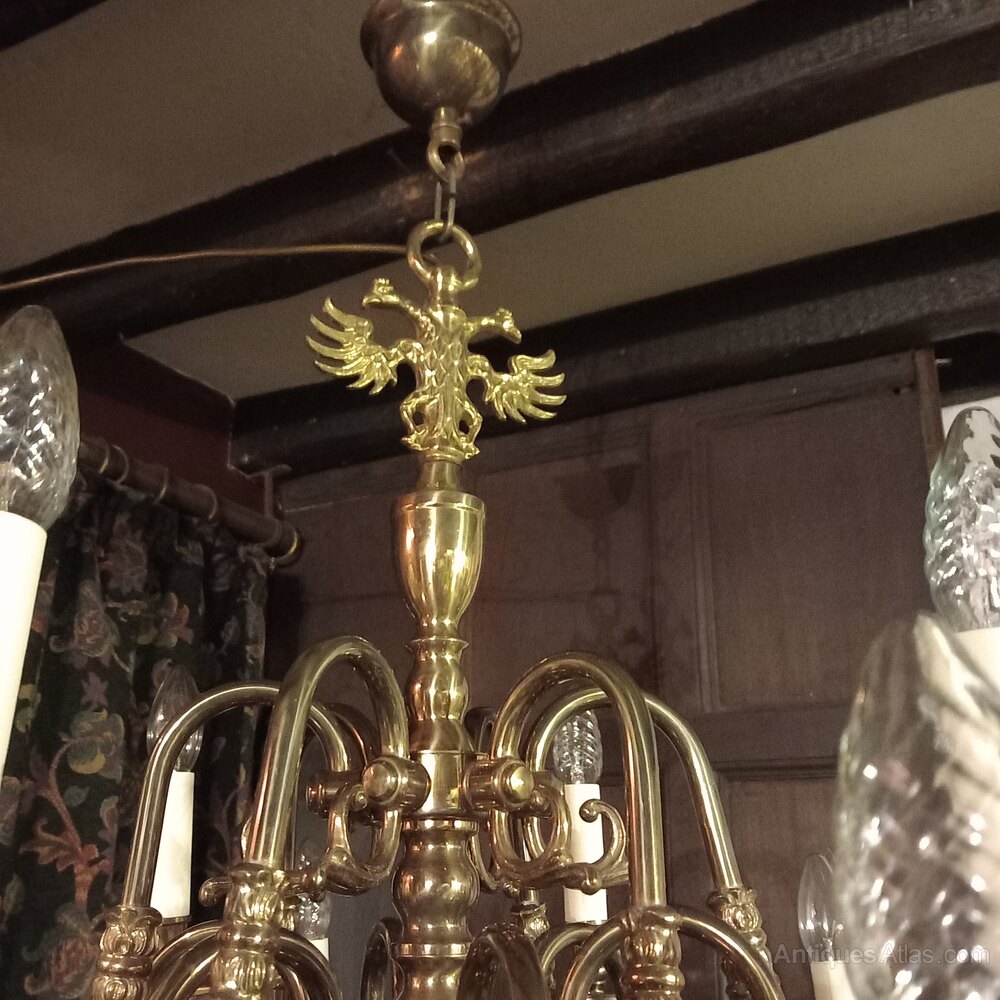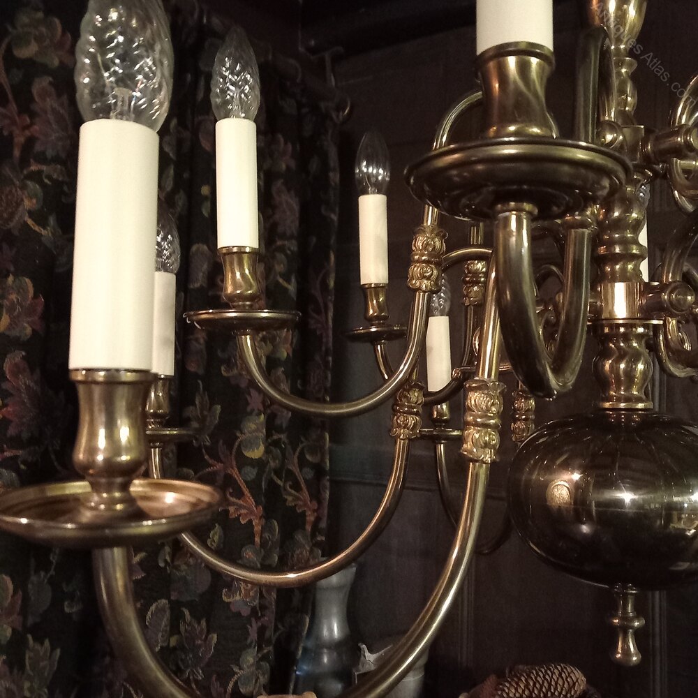A lovely large compact 2 tier 12 light antique brass Flemish chandelier. This chandelier has aged well over then years and has developed a beautiful deep mellow brass patina. This chandelier has been fully rewired and has been pat tested and fitted with new candle tubes.Distance Selling Regulations
