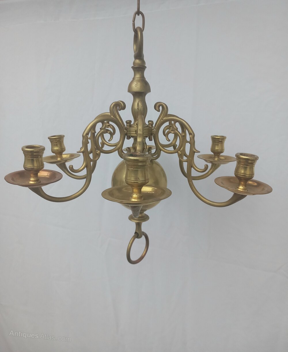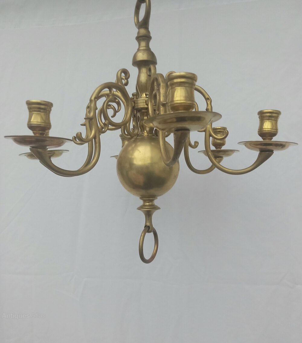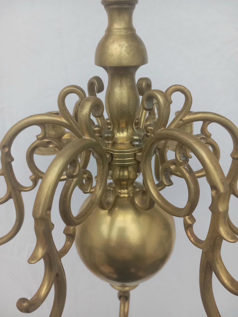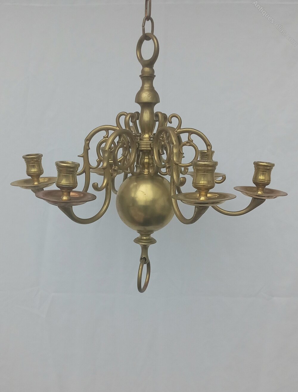 Superb Dutch style 19th century heavy brass chandelier for candles. Six arm, quality made item with no damage or repairs visible. 45cm by 45cm approximately. Long matching chain 55cm .Not all stock is located at our premises so please contact us before visiting if you wish to see specific items. We will make a full refund of the purchase price (excluding any delivery costs) if you are not fully satisfied with your online purchase. At present we ship only to mainland UK and local delivery is free . Customers are of course able to collect from Plymouth or make their own arrangements for pick up by national or international couriers .