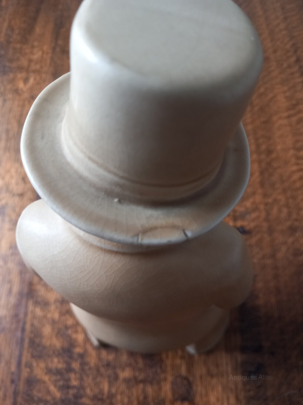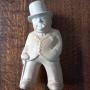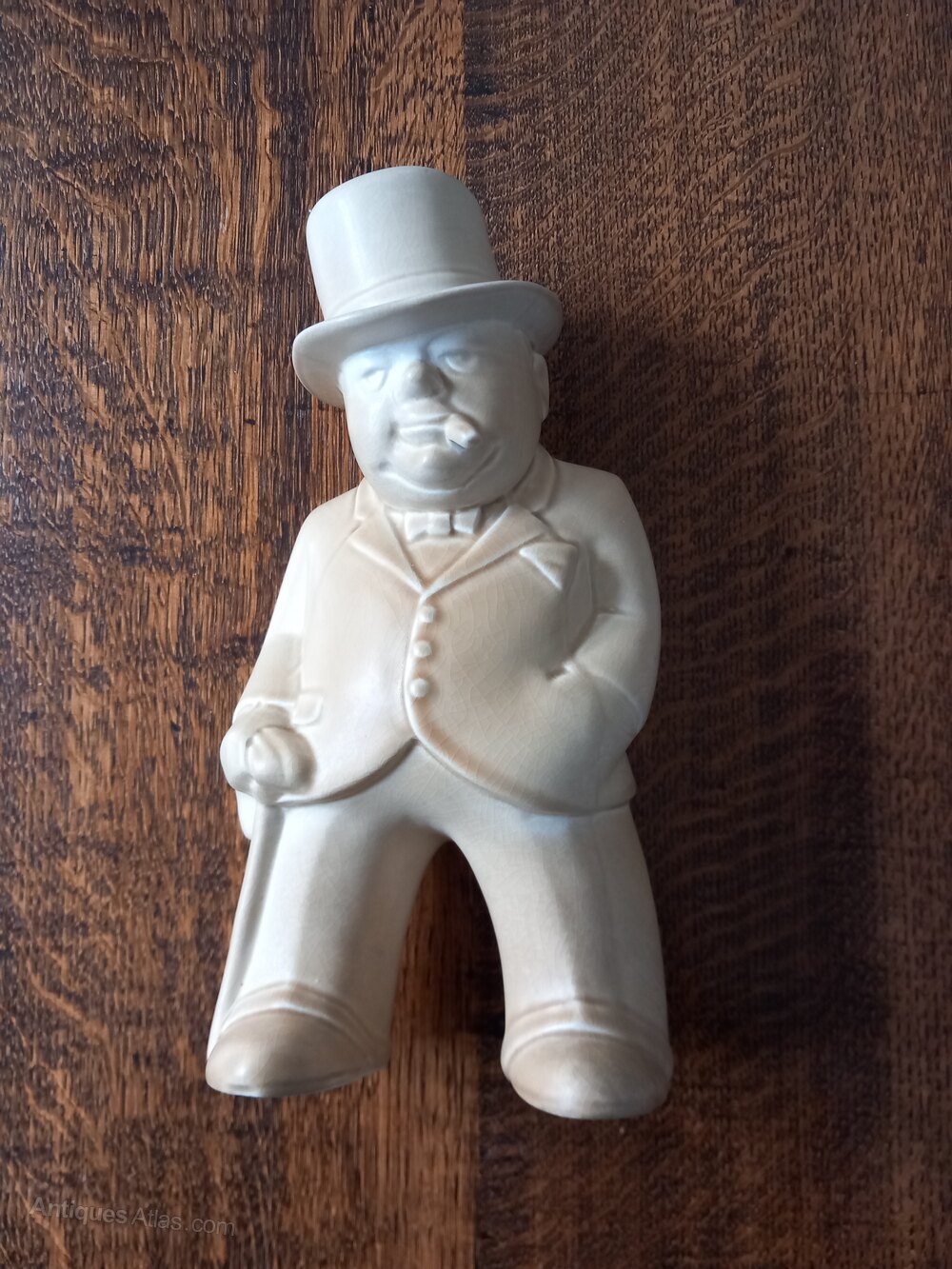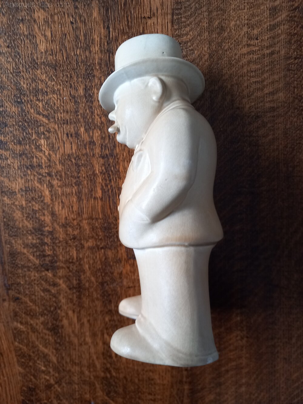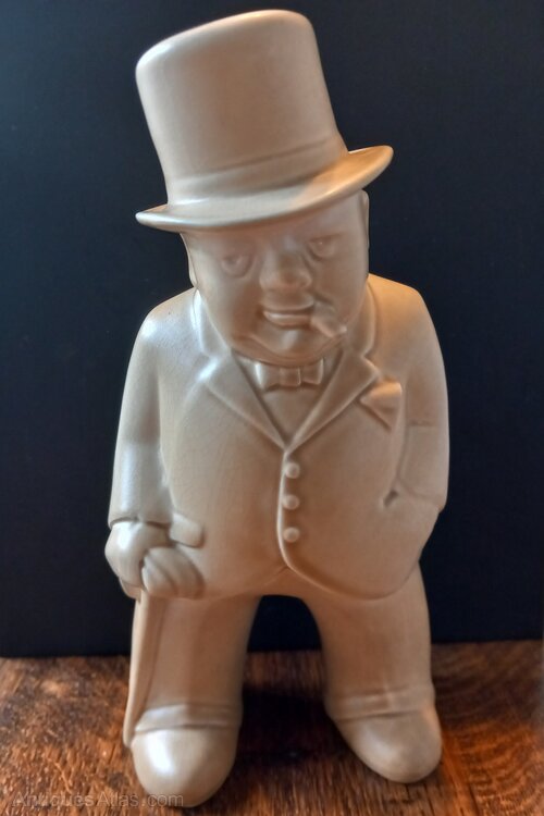 Bovey Pottery figure of Winston Churchill of the "Our Gang" series of 16 figures designed by architect Fenton Wyness. Approximately 21cm tall in a cream or oatmeal colour glaze to which ⁸there is some crazing . A small repair to the brim of his hat , see pics, and a small chip to the back of one foot are unseen when displayed.Not all stock is located at our premises so please contact us before visiting if you wish to see specific items. We will make a full refund of the purchase price (excluding any delivery costs) if you are not fully satisfied with your online purchase. At present we ship only to mainland UK and local delivery is free . Customers are of course able to collect from Plymouth or make their own arrangements for pick up by national or international couriers .