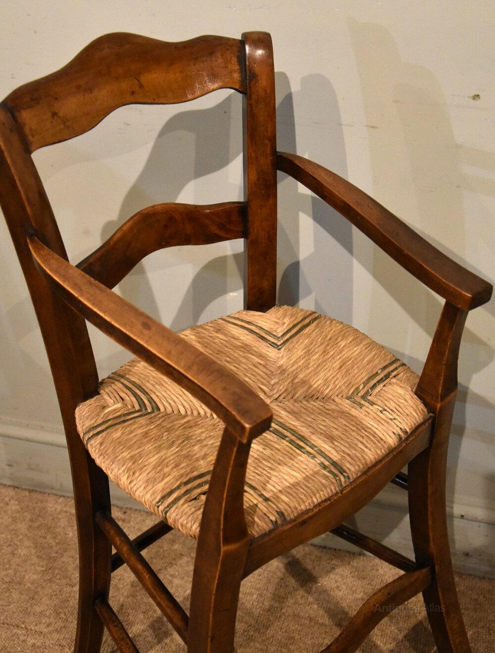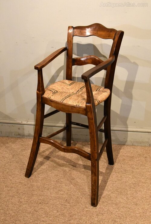 A charming little French walnut and Beech Childs high chair retaining its attractive original rushed seat. superb colour and condition.Dimensions