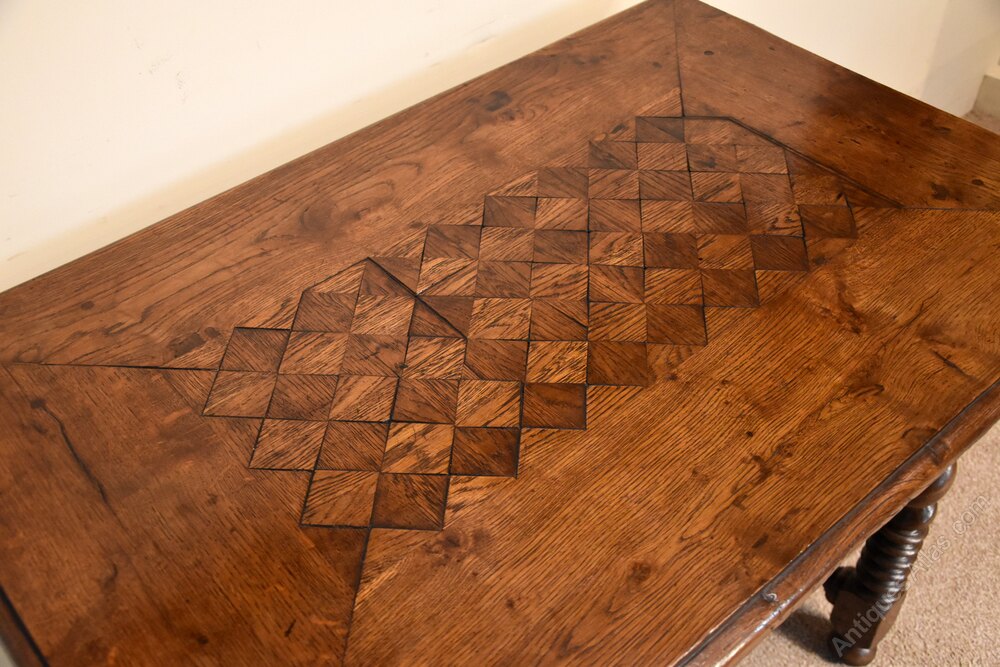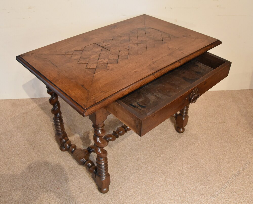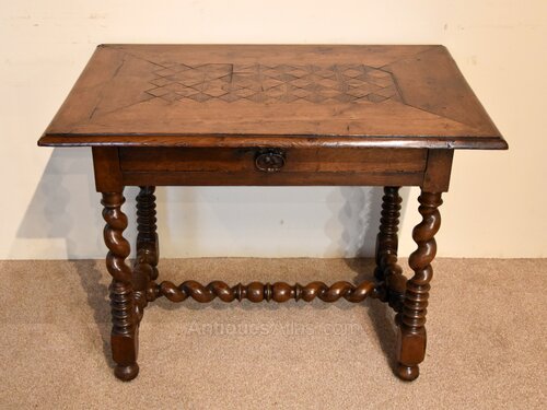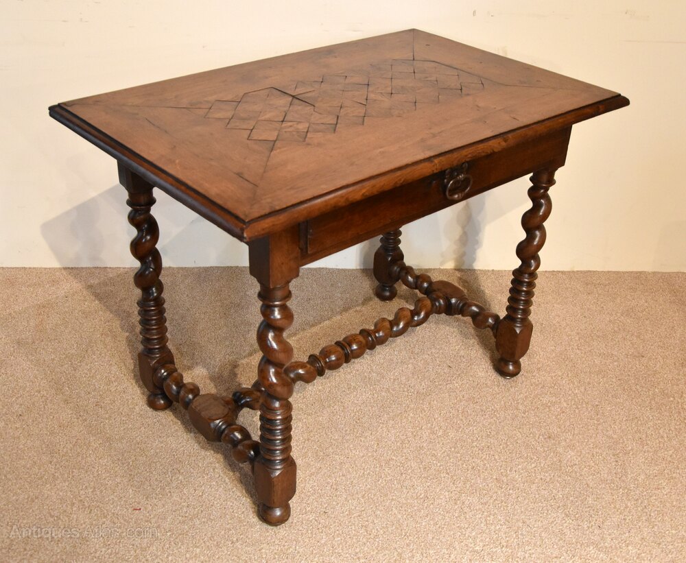 An elegant Late 17th Century Parquetry side table on barley twist base with single drawerand bun feet