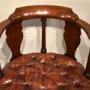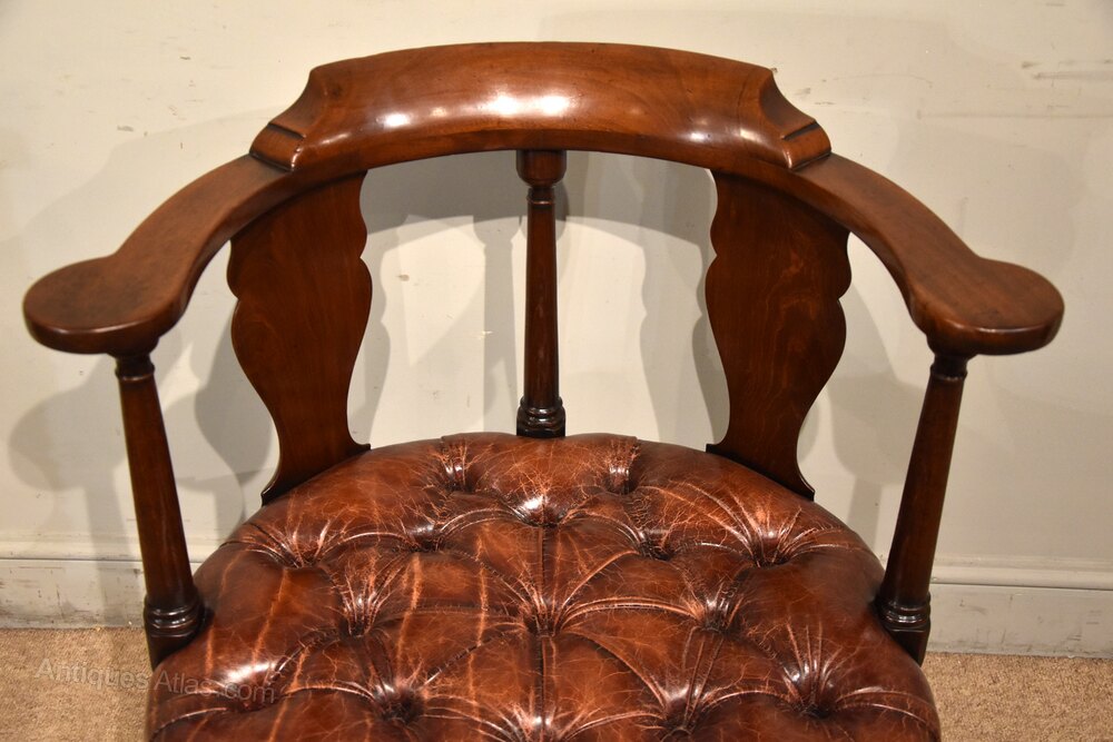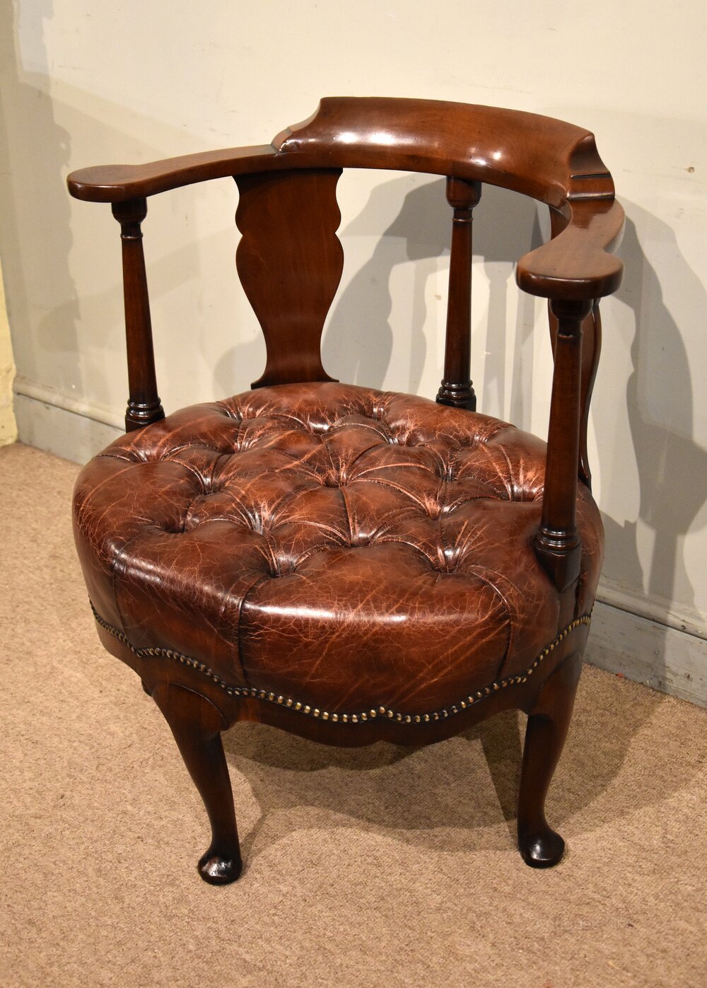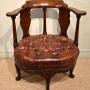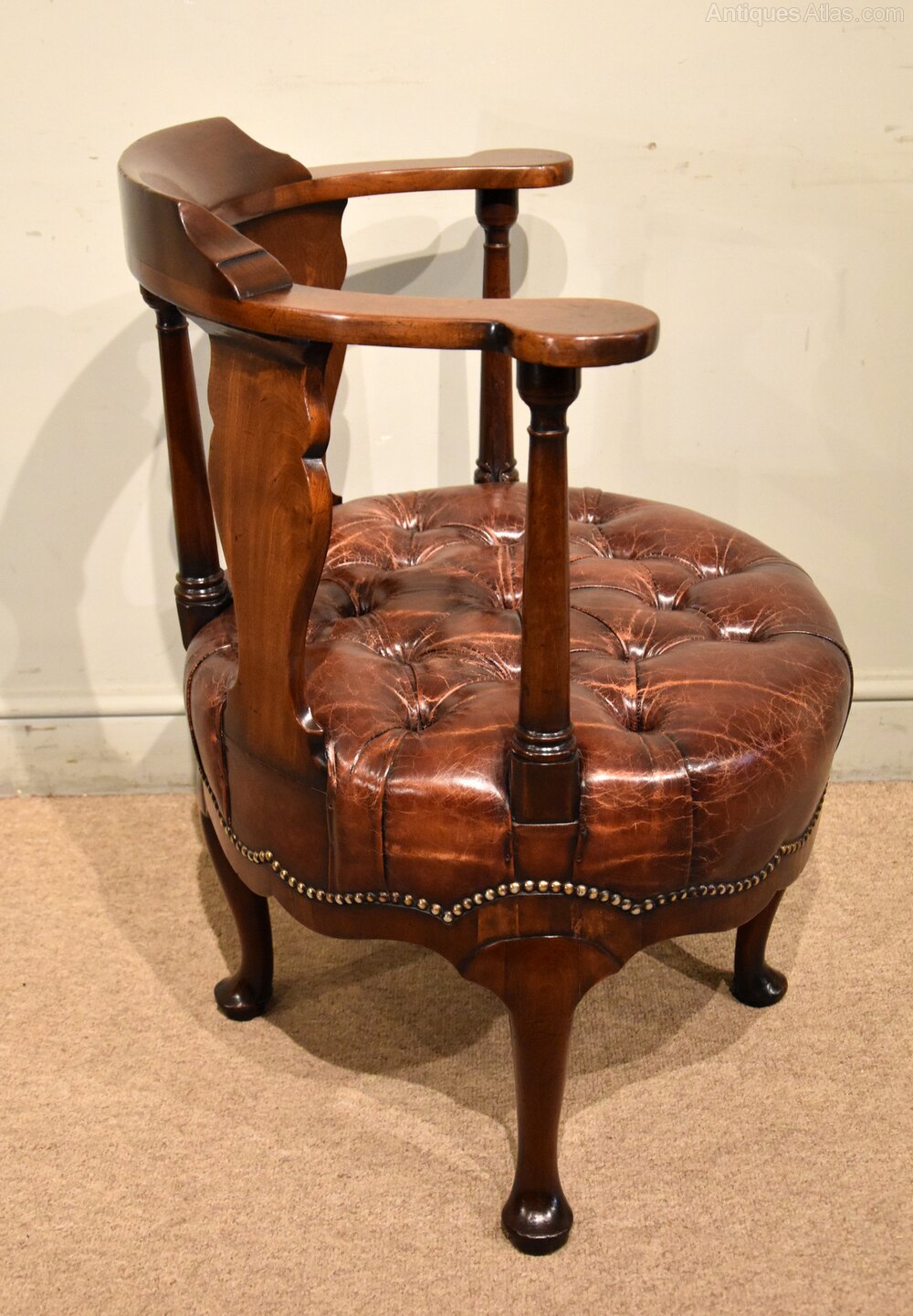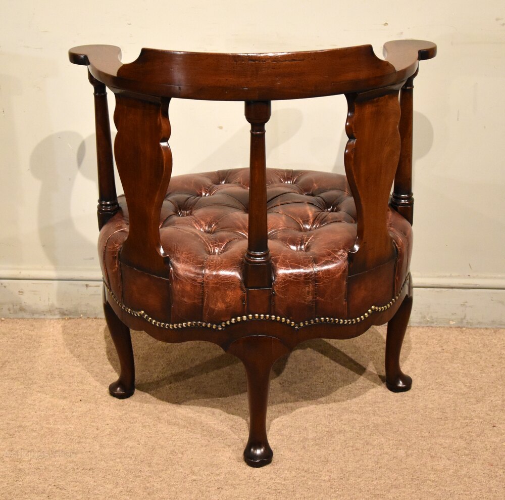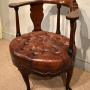 George II mahogany desk chair of rare design with baluster splats about an oval satin buttoned hide seat, above shaped cabriole legs.Height 33" 84