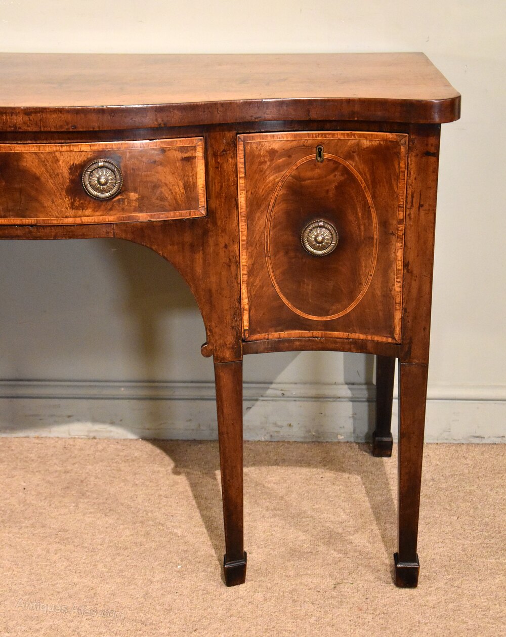 A good George III serpentine fronted mahogany sideboard on tapered legs terminating in spade feet the piece of outstanding patina and colourHeight 34inches 86cm
