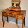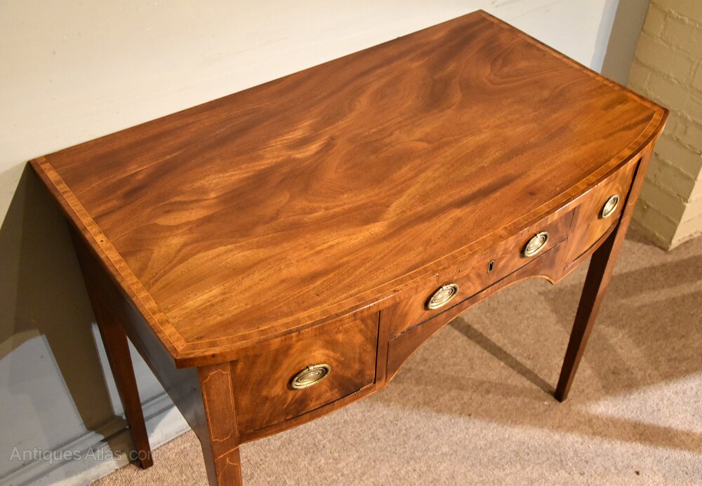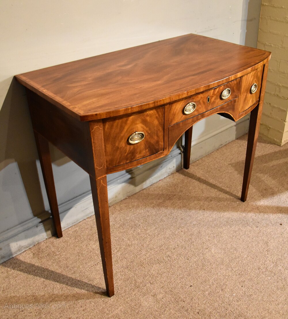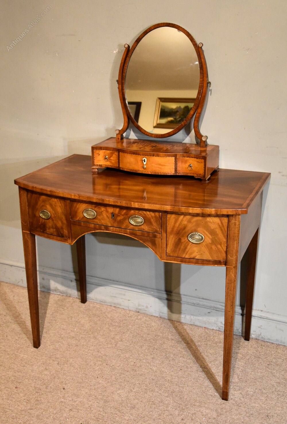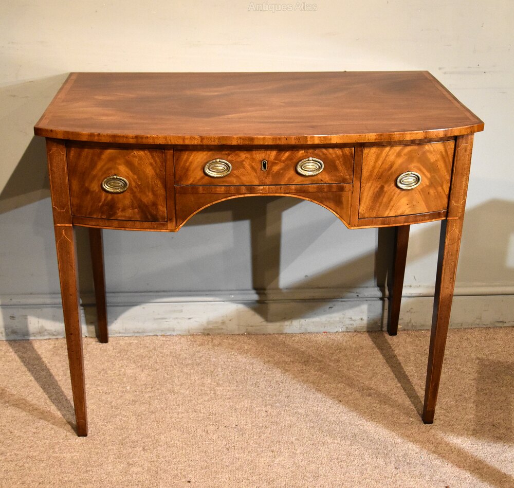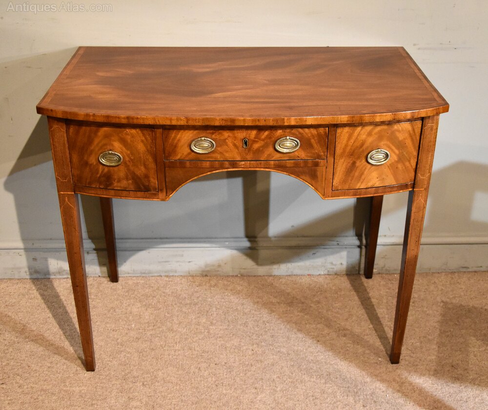 An elegant George III mahogany bow fronted side /dressing table on tapered legs and three drawers. The piece with crossbanded top and later handlesHeight 30.25" 77cm