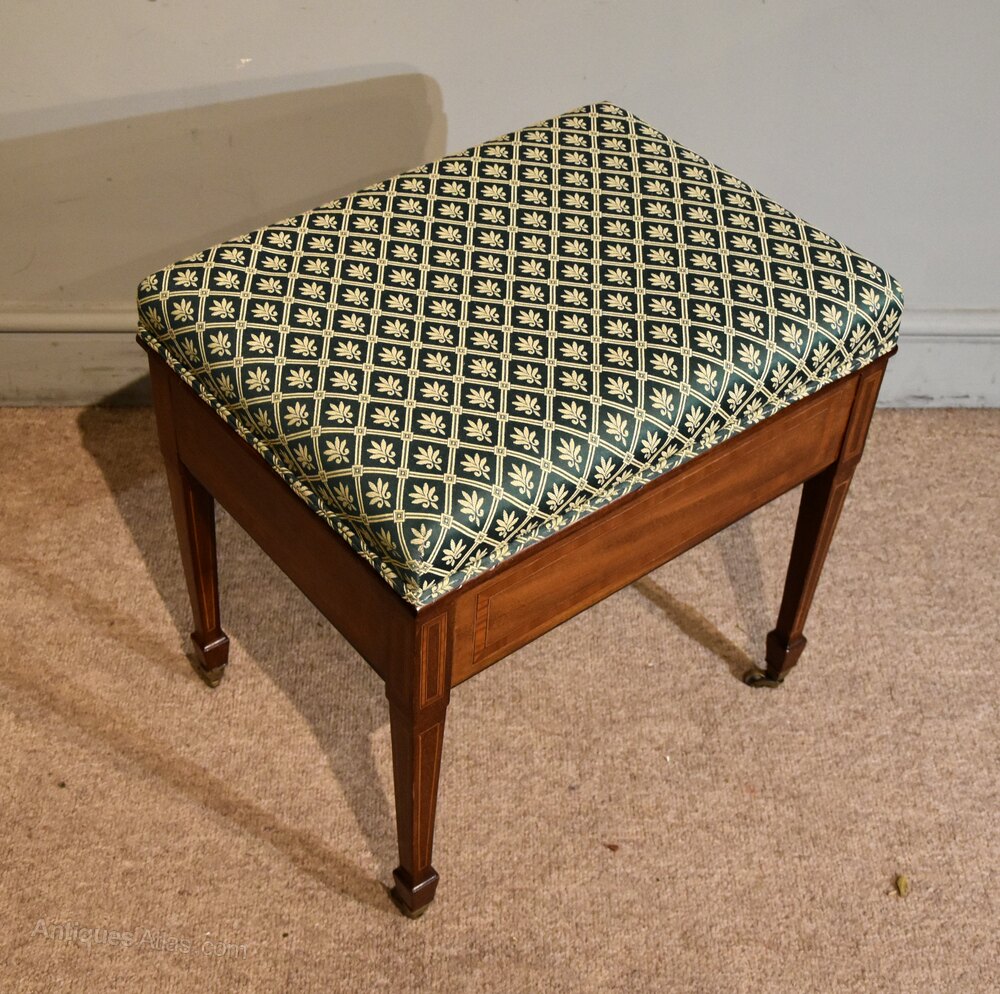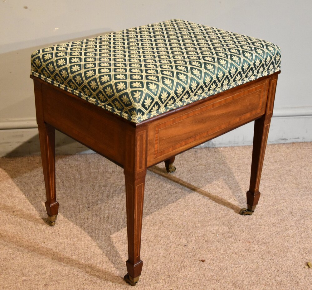A handsome Edwardian mahogany and satinwood music stool on tapered legs and original brass casters. Lifting lid c1910Height 20.5" 74cm