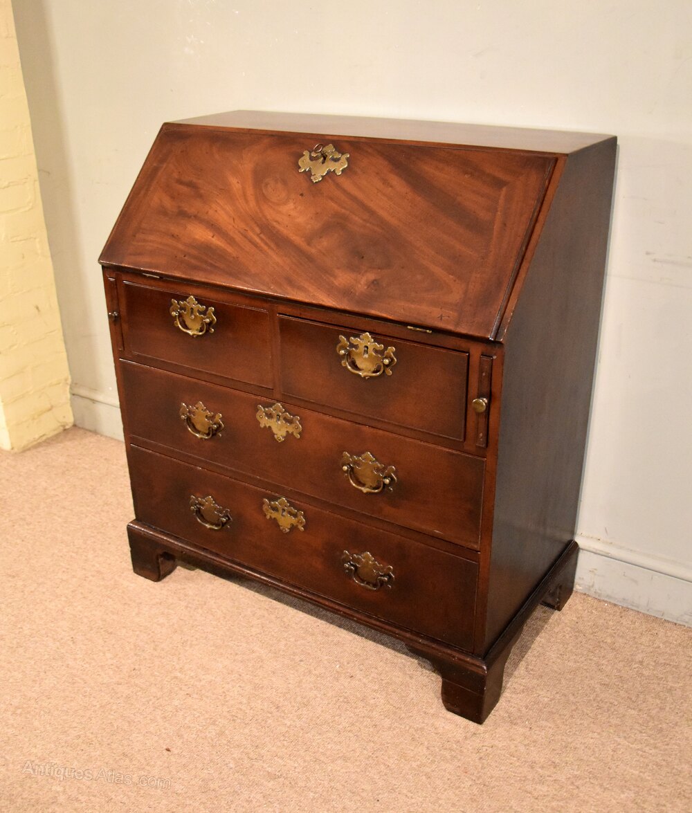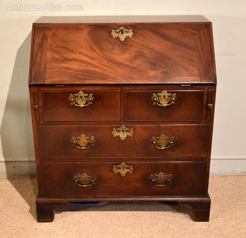 A handsome George II cuban mahogany bureau of small proportions and stunning rich colour. The interior fitted with banks of drawers and original brass plate handlesHeight 38.5" 98cm