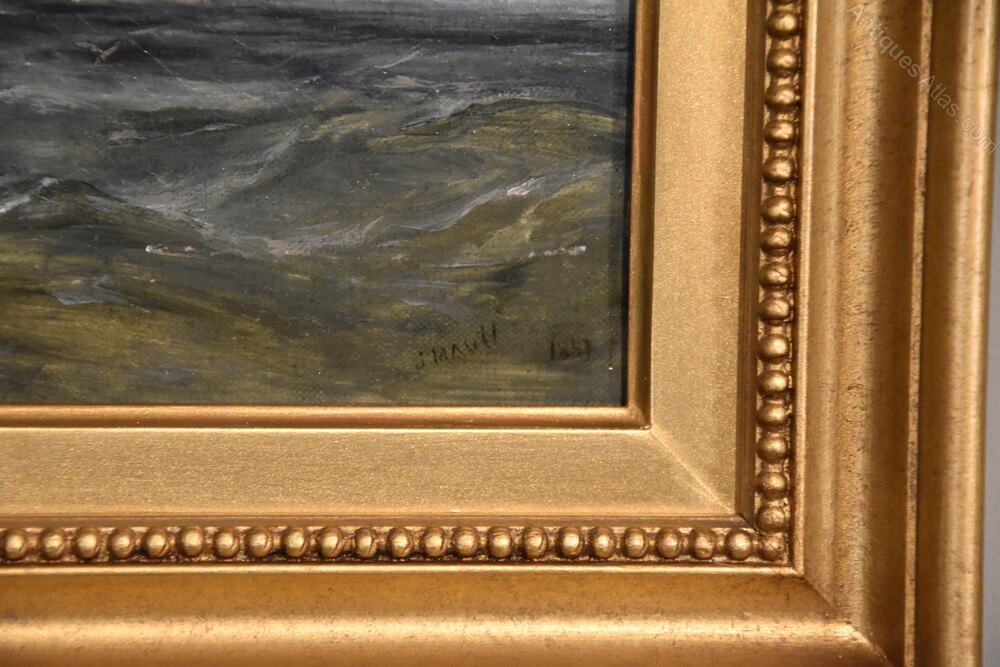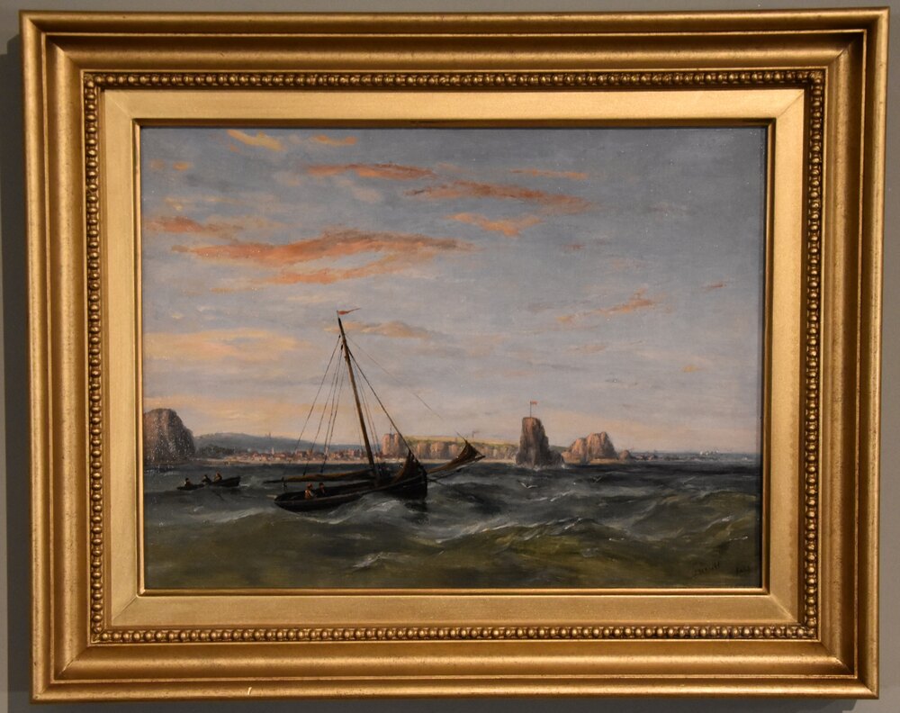 Oil Painting by James Maule "Fishing Boats going out" 1835 - 1863 Lewisham painter of marine subjects. Exhibited regularly in London represented in the Enfield Museum. Oil on canvas. Signed and dates 1867Dimensions unframed 12 x 16