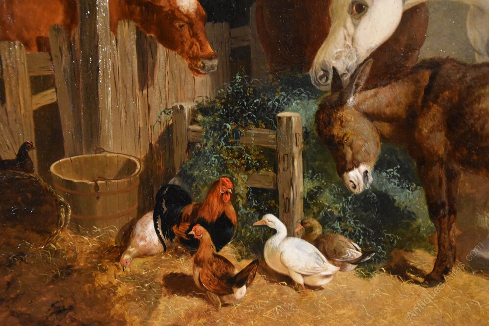 Oil Painting by Henry Charles Woollett "A Stable Interior" 1826 - 1893 A London painter of rustic landscapes with animals. Similar to John Frederick Herring. Exhibited at the Royal society of British artists. Oil on canvas. Signed and dated 1856 in original frameDimensions unframed 20 x 30