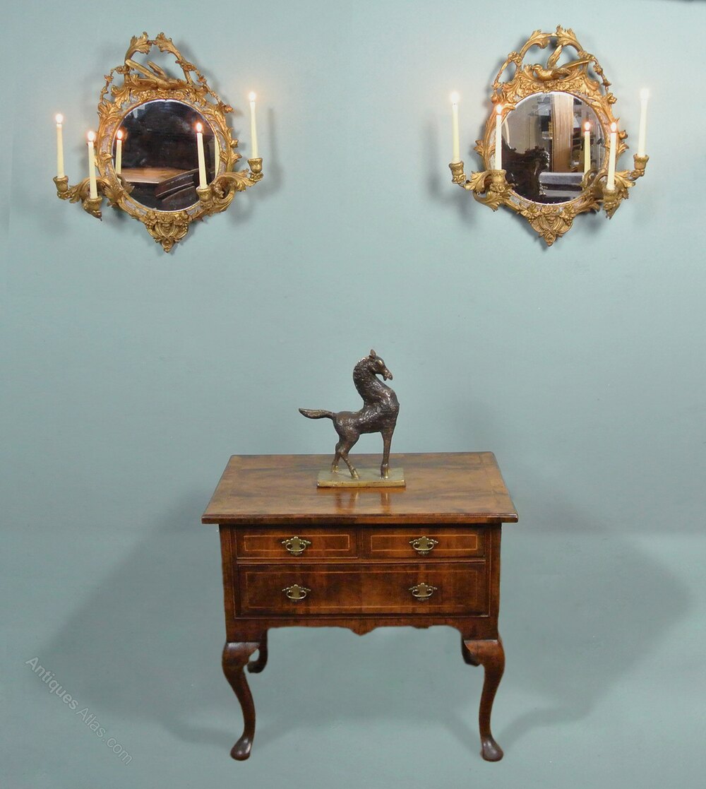 A very attractive and early pair of giltwood mirrors with pine carved frames with gesso and gilt overlay. The frames with foliate scrolls and open flower heads, vines and each with crest of a beautiful skylark – a symbol of love and joy.Each mirror with four original candle sconces and green/gold painted reserves bordering the mirror plates.