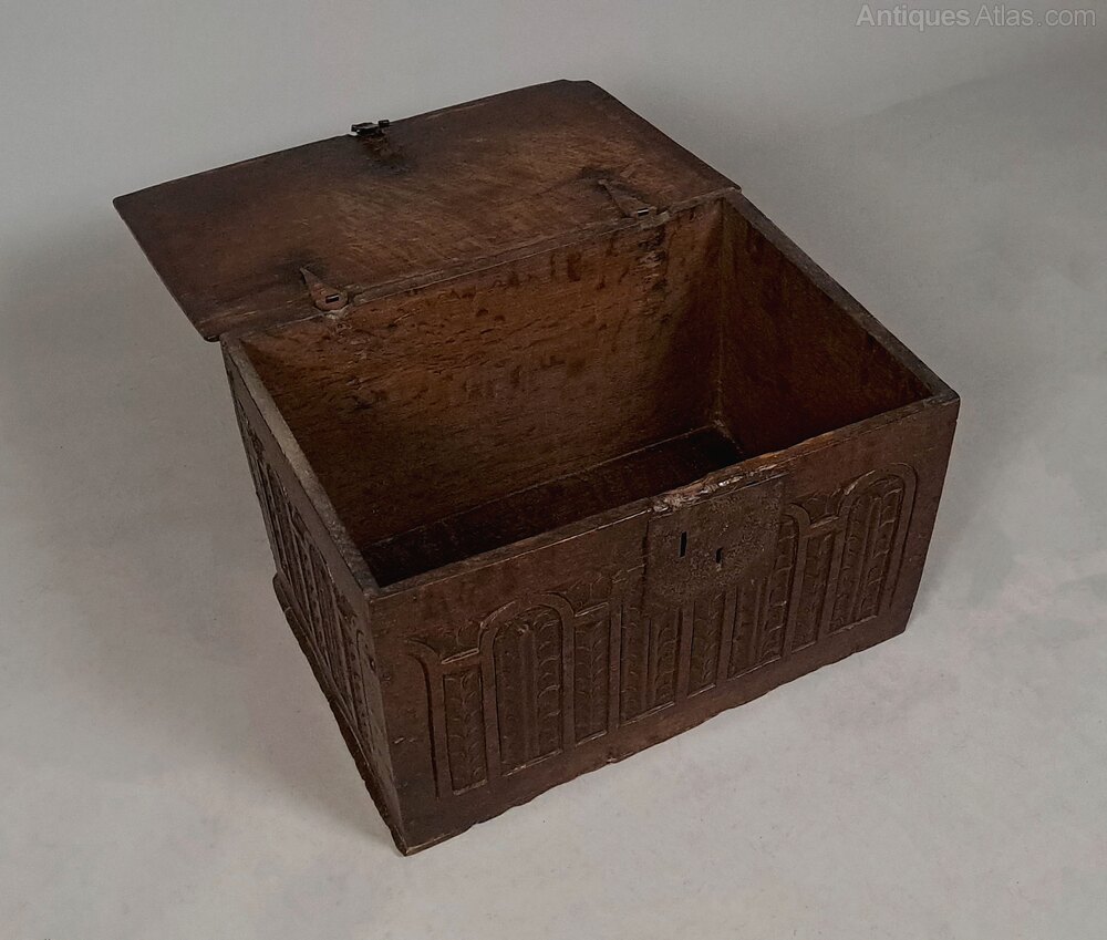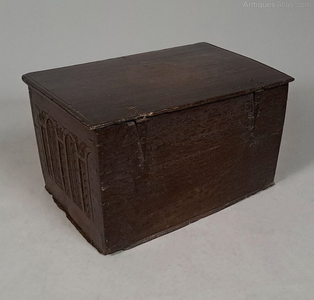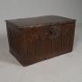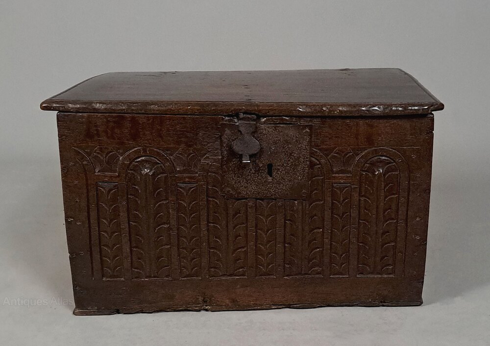 With a fabulous colour and natural deep patination, this wonderful very small oak chest has retained its original timbers throughout and original lock plate and hasp.The front and side boards carved with palm leaves in arched carved and punched borders with carved tulip crestings. With punched open flowerhead decoration to the flanks and thumb moulded border to the lid.