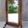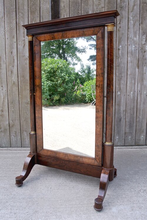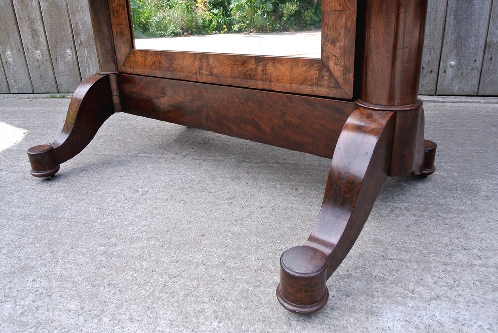 An impressively large and beautiful English cheval mirror of particularly fine quality and dating from c.1815.Of French Empire design, the original frame with substantial tapering columns of figured mahogany mounted with exquisitely incised bronze mounts in the classical form, and the base of each column with large bronze rings of matching form.