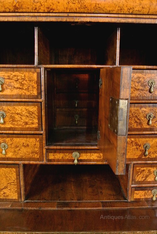 The outer fall with a central mulberry panel bordered by three wide bands, two of burr walnut and one of mulberry outlined with walnut crossbanding. The flanks to the fall also crossbanded in walnut.The two short over two long principal drawers with figured mulberry fronts and walnut crossbanded borders. The concealed cushion drawer beneath the cornice is dressed with mulberry veneers. Full wainscot oak linings, original and beautifully made. Original top, bottom and back boards and beautiful double ogee mouldings to the flared cornice, waist and base.