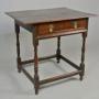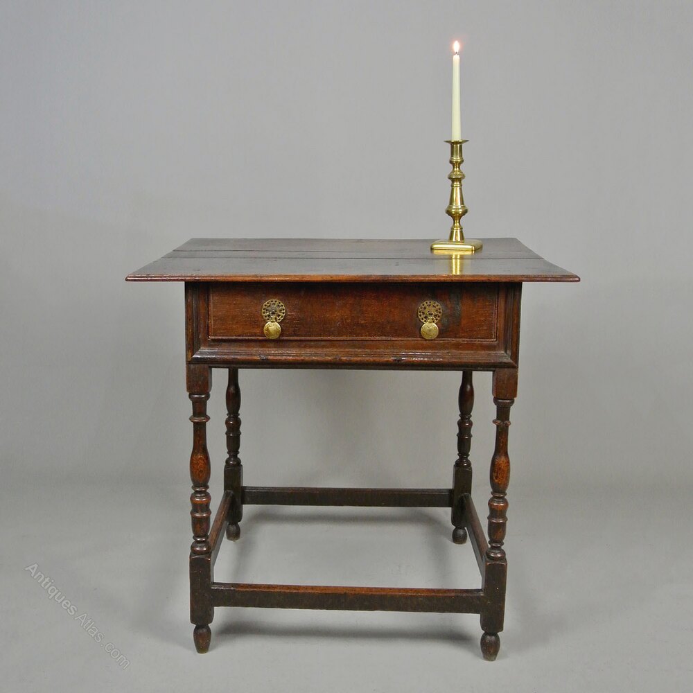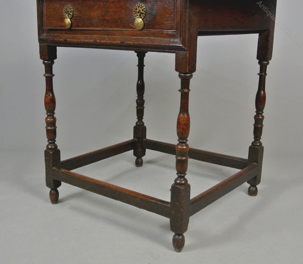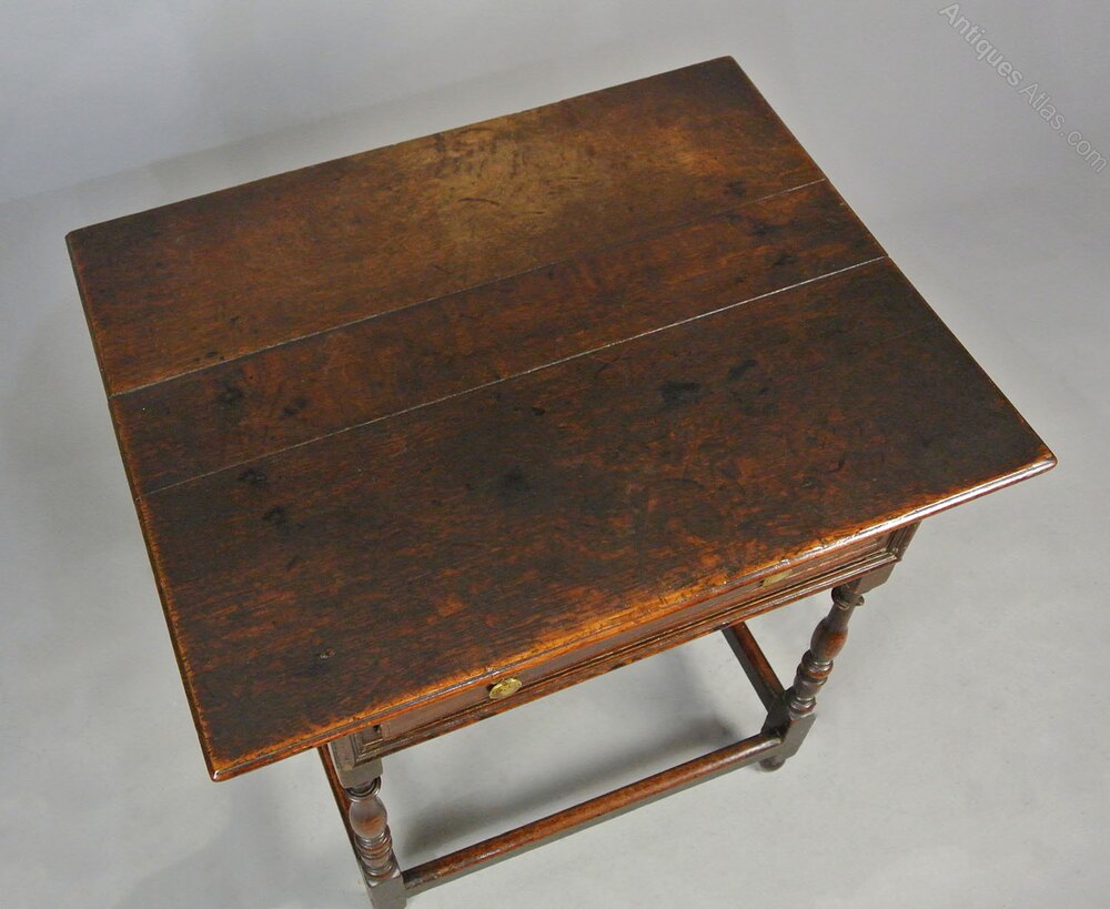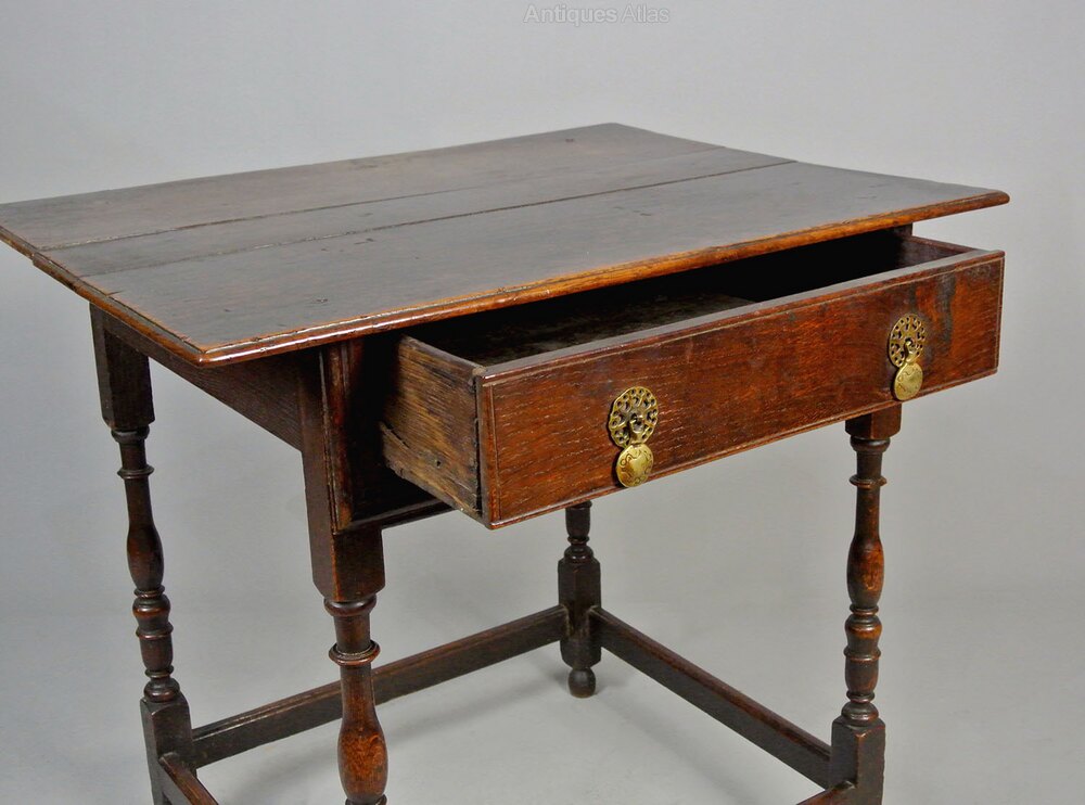 A most attractive and elegant late 17th Century oak lowboy with a lovely natural and well developed patina and rich warm colour.The single drawer with original oak lining and early, possibly original, brass drop handles with snaped fixings, filigree backplates and brass penny engraved drops – the engraving now worn smooth from use.