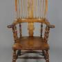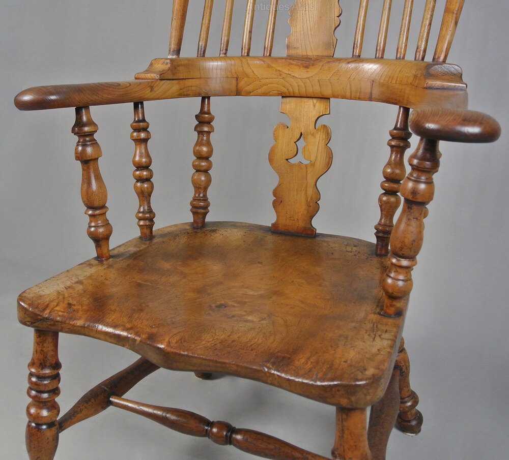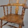 Much of this chair is made in elm – not just the seat but the bow arm and fine splat, with an ash hoop and spindles. The turned arm supports, legs and stretchers are in solid yew wood with lovely dark burred surface and this very dense, strong wood with so much character and colour.