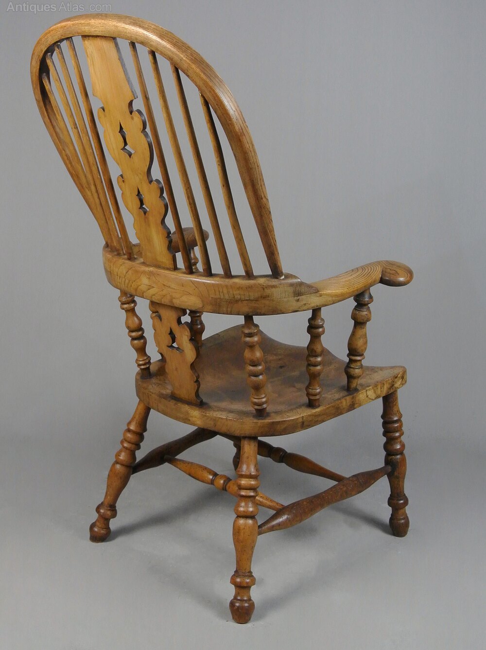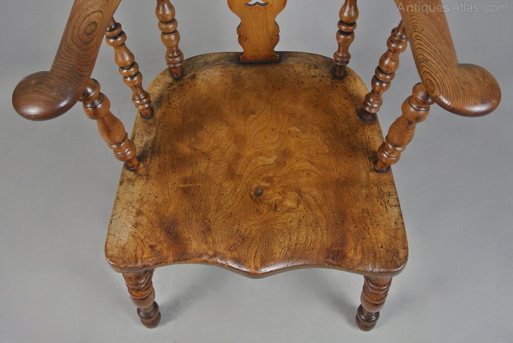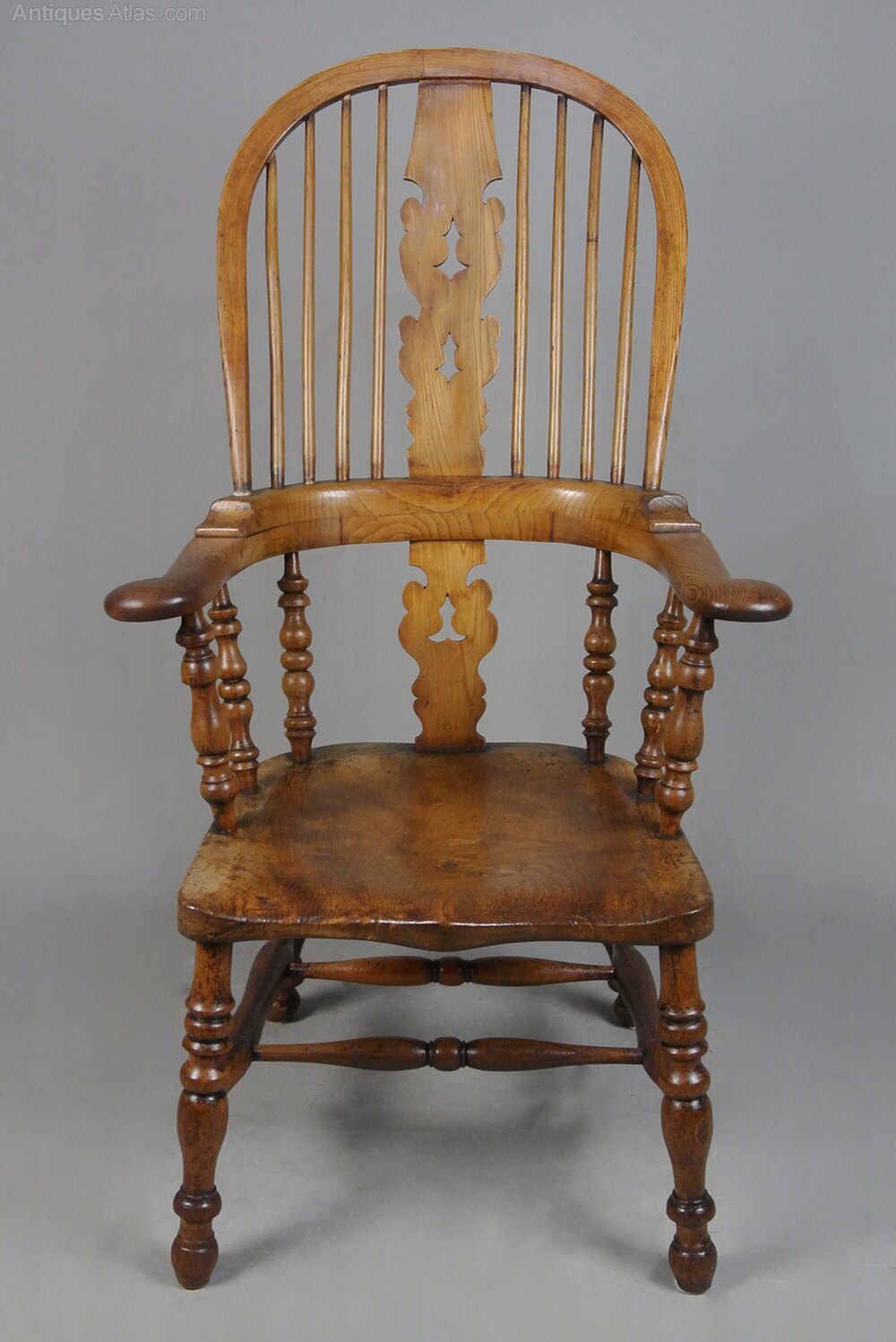 A most attractive and unusual Windsor chair made of yew wood, elm and ash and with wonderful colour and in superb original condition.Traditionally the saddle seats were made in elm because elm trees grow to such a size and girth that a wide and deep seat can be made from a single board. Ash is pliable, it can be steamed and bent to form hooped backs and arms, and easily turned to form legs and supports. The chairs could be partly made where the wood was felled and dried, on simple lathes working hand sawn timbers.