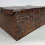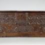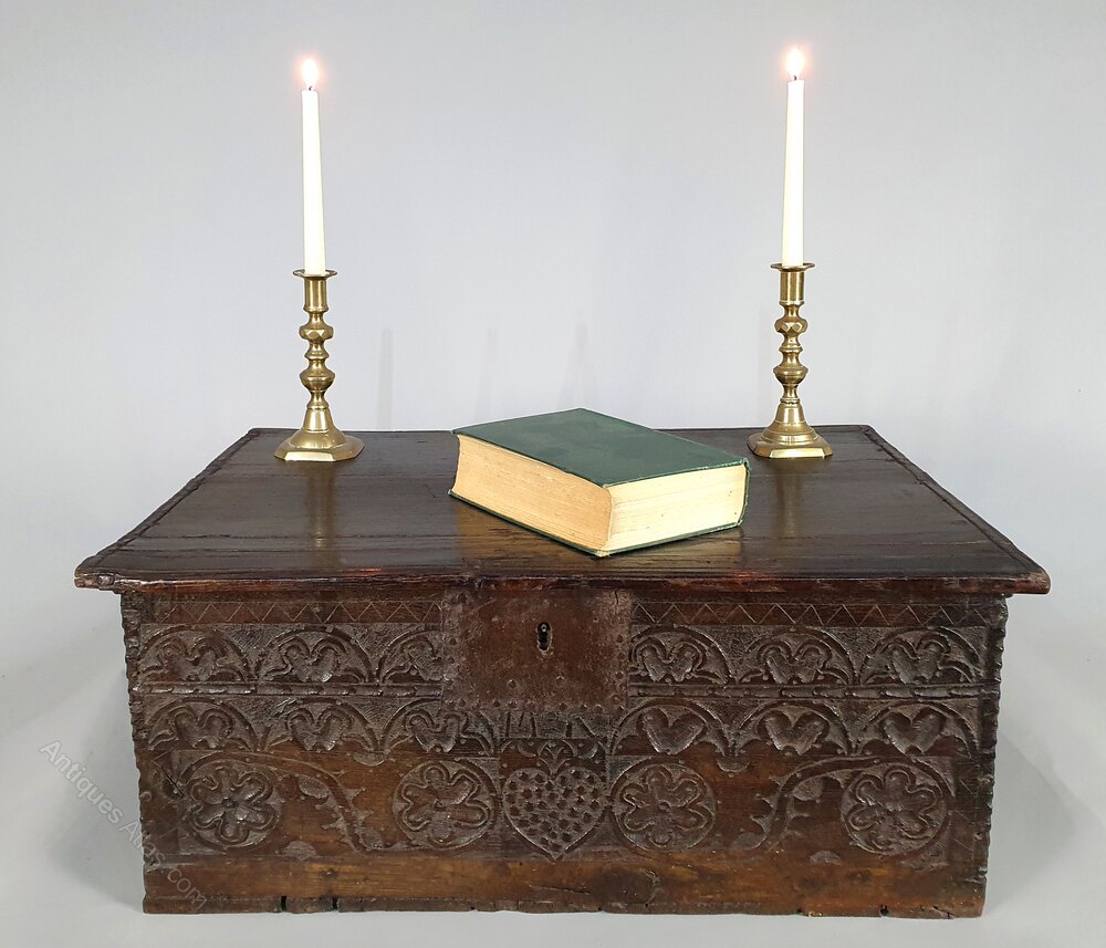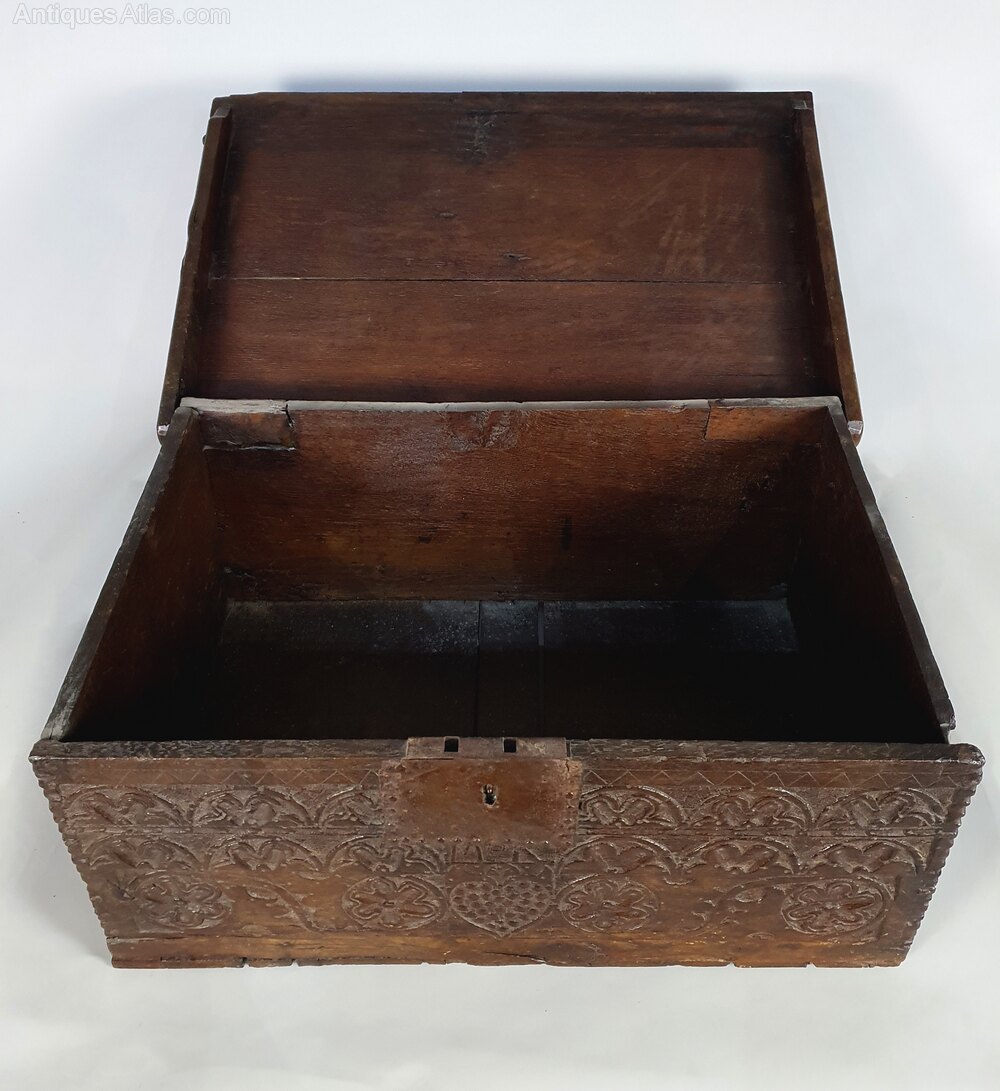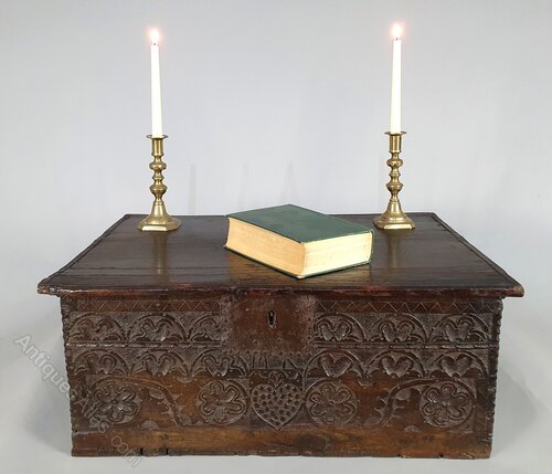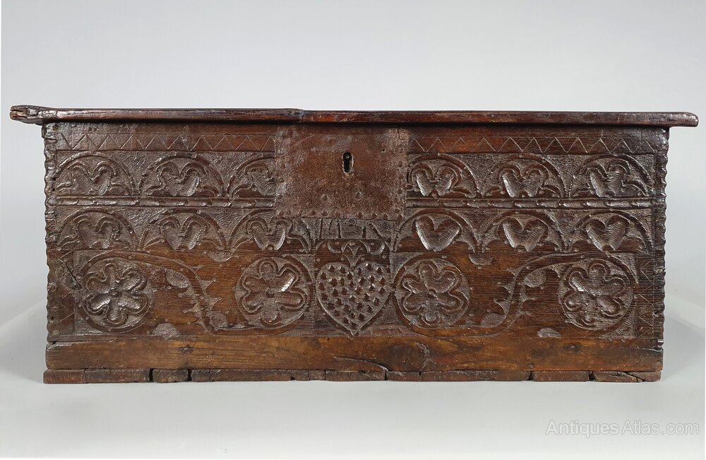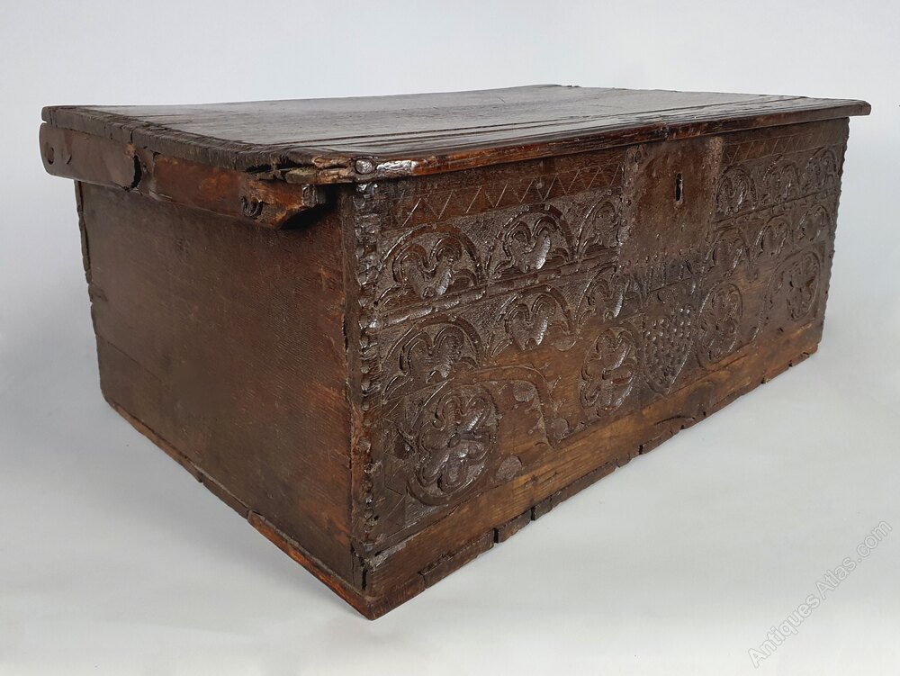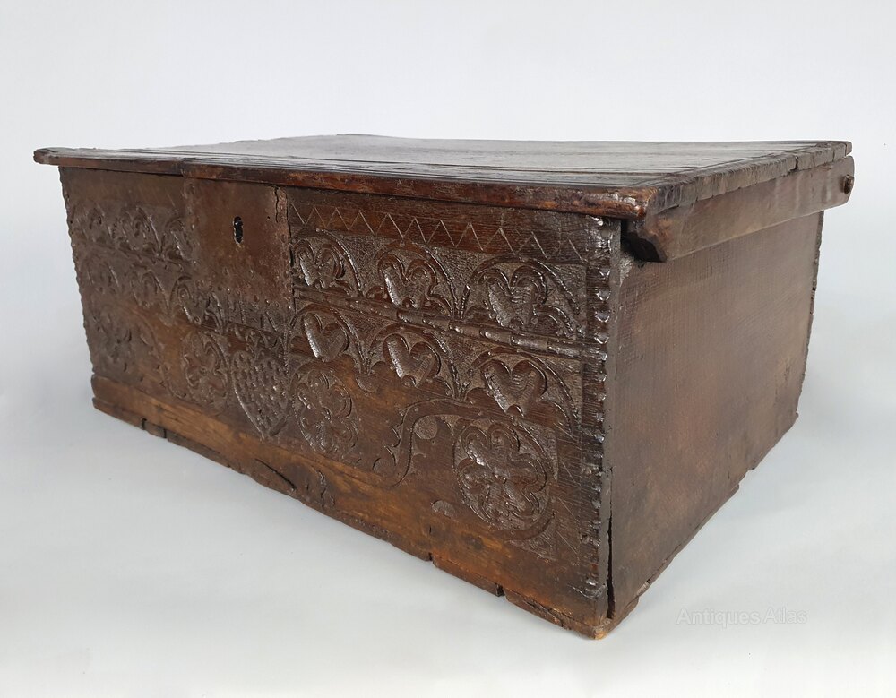 The front of the chest has scratch carved geometric decoration above three bands of deep confident carving, the lowest band has running S scrolls centred by flowers and the upper two band are foliate arcades of running strapwork each centred by a small heart. The box corners flanking the front panel are deeply notched.