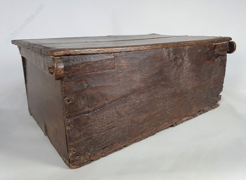 A really beautiful small and early oak chest, perhaps as a sewing or work box, heavy and robust, made by skilled hands in c. 1660 and clearly made as a token of love for ‘M A’.