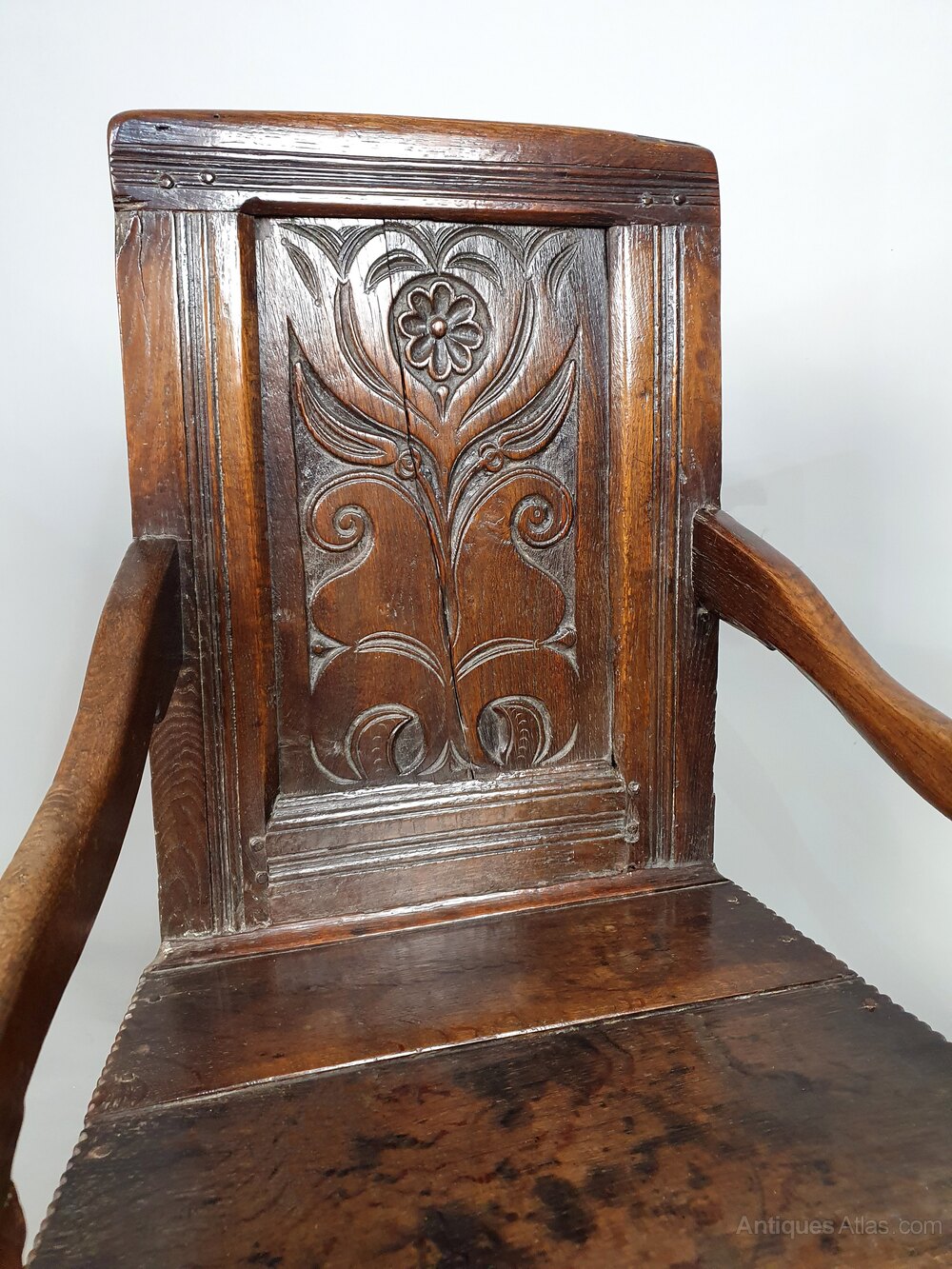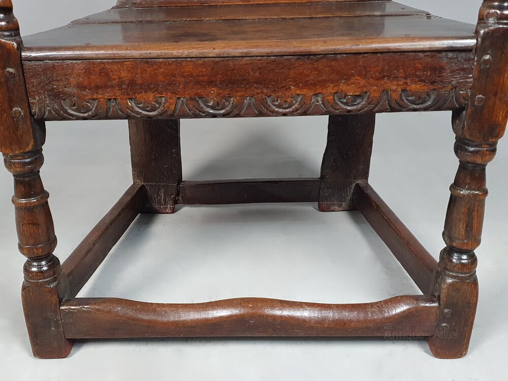 Beautifully grained elm and the colour of the oak combined with the simple shaping and carved panel indicates a provincial chair probably made in Wales in around 1630.