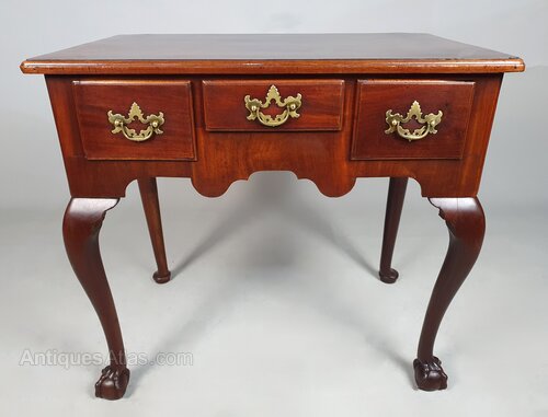 A wonderful small and beautiful red walnut lowboy with three drawers and original brass batswing and bail handles over a well shaped apron and all set on lovely long and elegantly shaped cabriole front legs terminating in substantial and original ball and claw feet.The drawers with solid red walnut fronts with ogee moulded borders and all three are oak lined with original very finely worked boards and tiny hand cut dovetails.