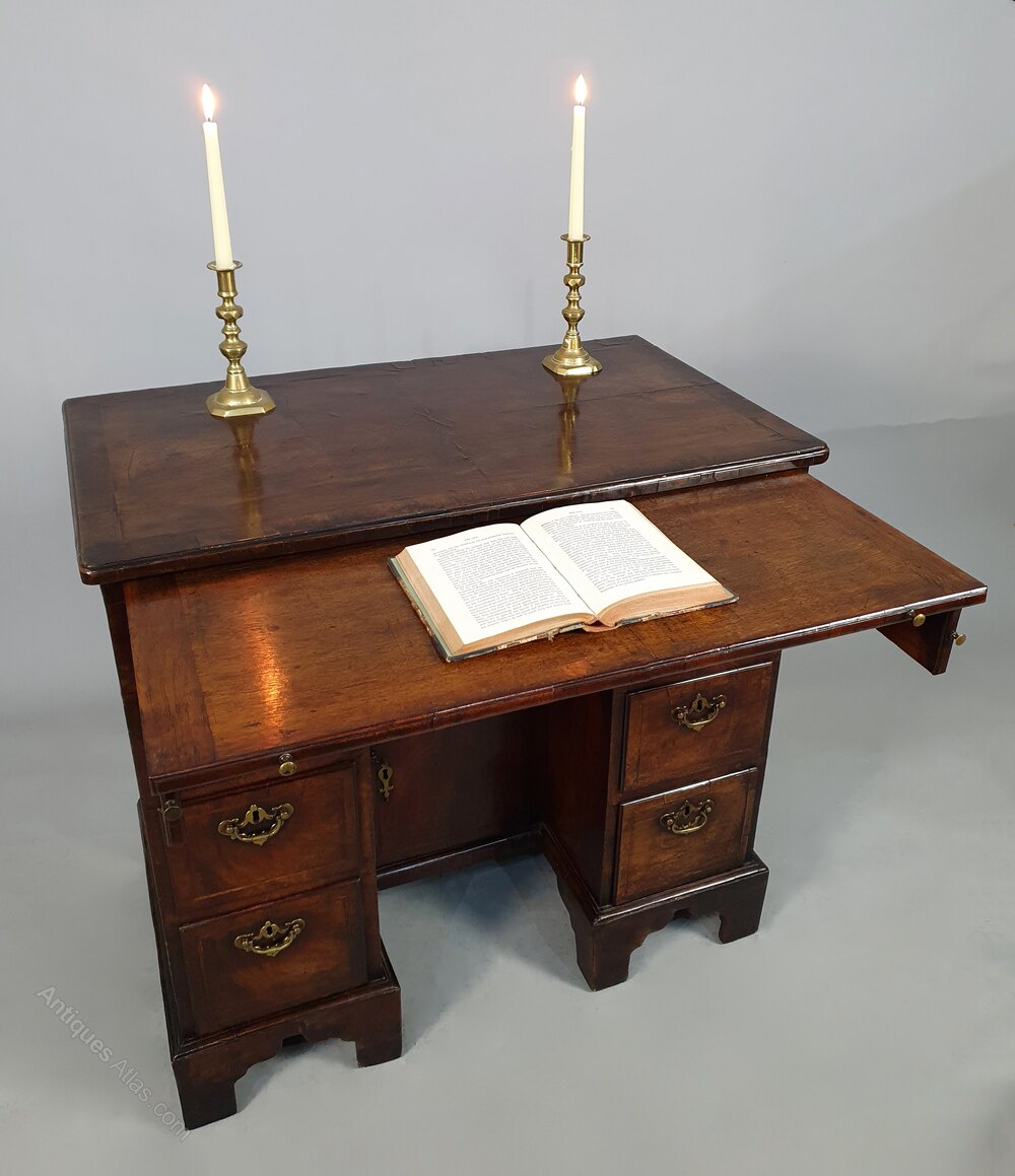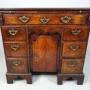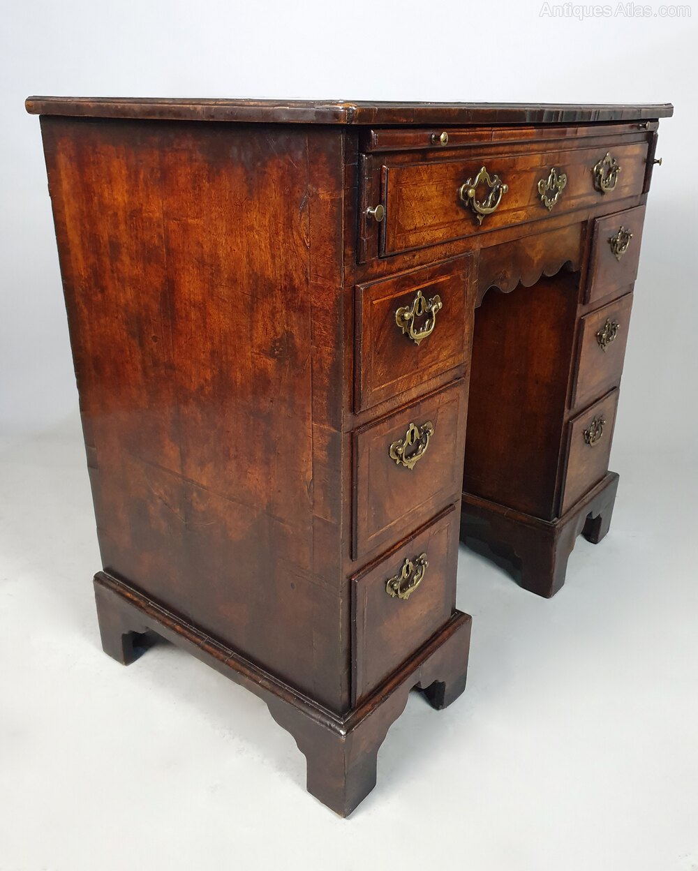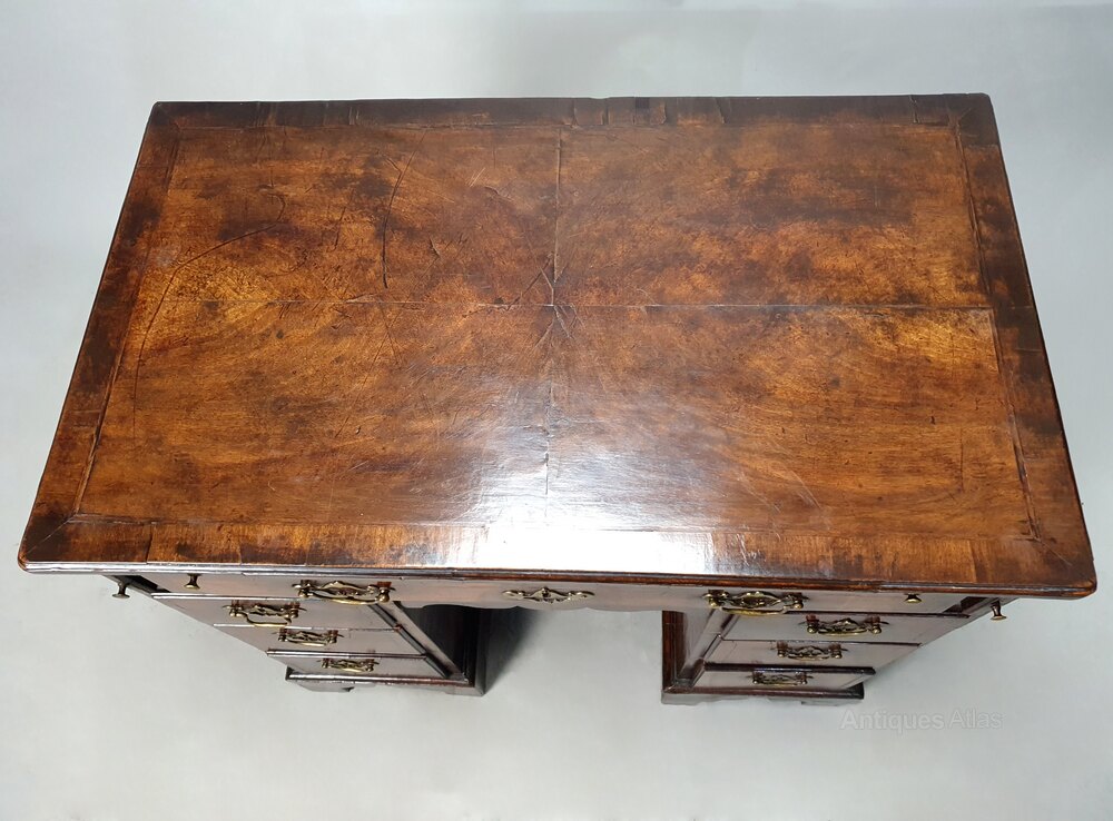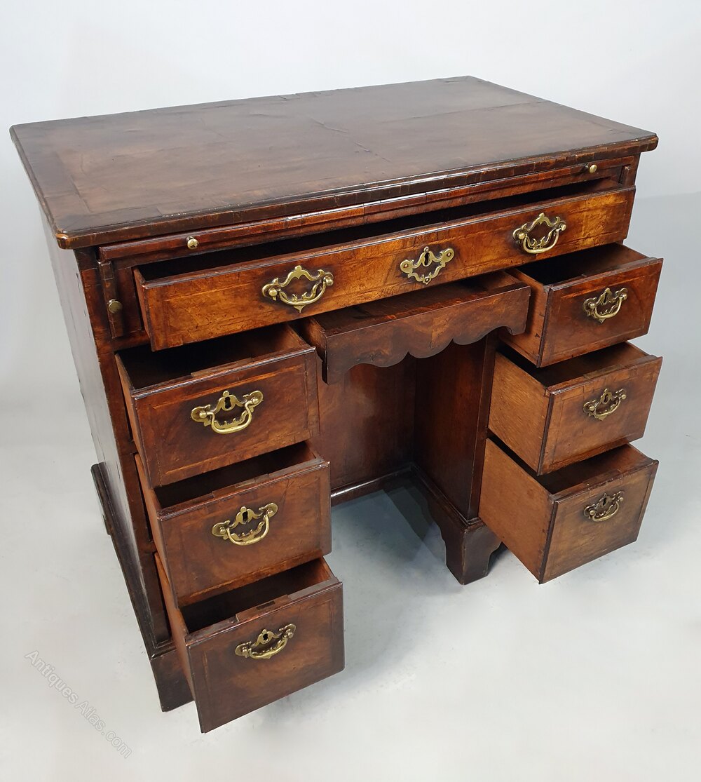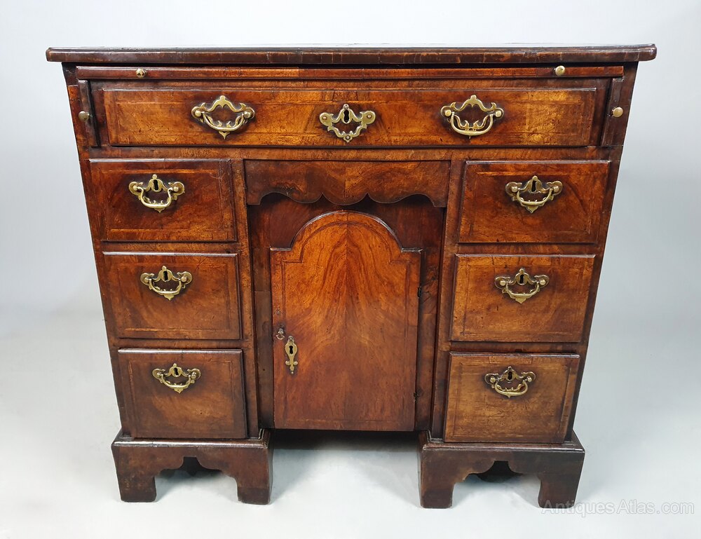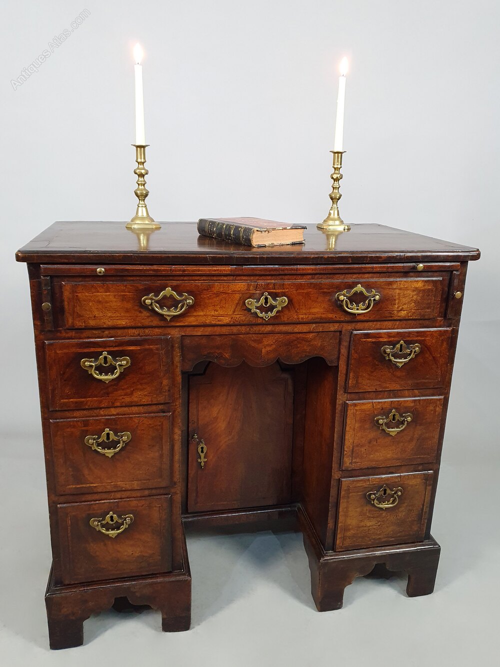 With a superb colour and patina, this is a particularly fine early Georgian kneehole desk demonstrating the highest quality period cabinet work and with a brushing slide, beautifully made and lined oak drawers with fine dovetails and thickly cut and well matched walnut veneers with crossbanding and featherbanding dressing the solid oak carcase.A most ingenious and rarely seen feature is that the kneehole cupboard slides forward when the desk is not in use, giving this piece a secondary use as a sideboard.