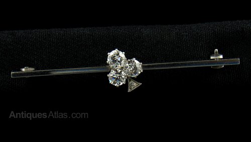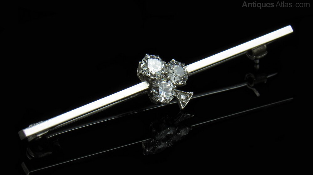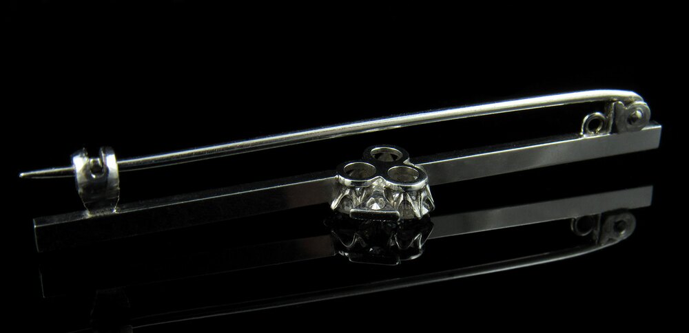 A dazzing and beautiful 18kt solid white gold bar brooch which is set with three large and brilliantly sparkling old European cut diamonds (VS1-VS2 clarity) and almost clear in colour, (tested as F-G).The three principal diamonds totalling 0.89 carats and there is also a small triangular diamond at the tail of approximately 0.1 carats, the setting in the design of the Ace of Clubs.