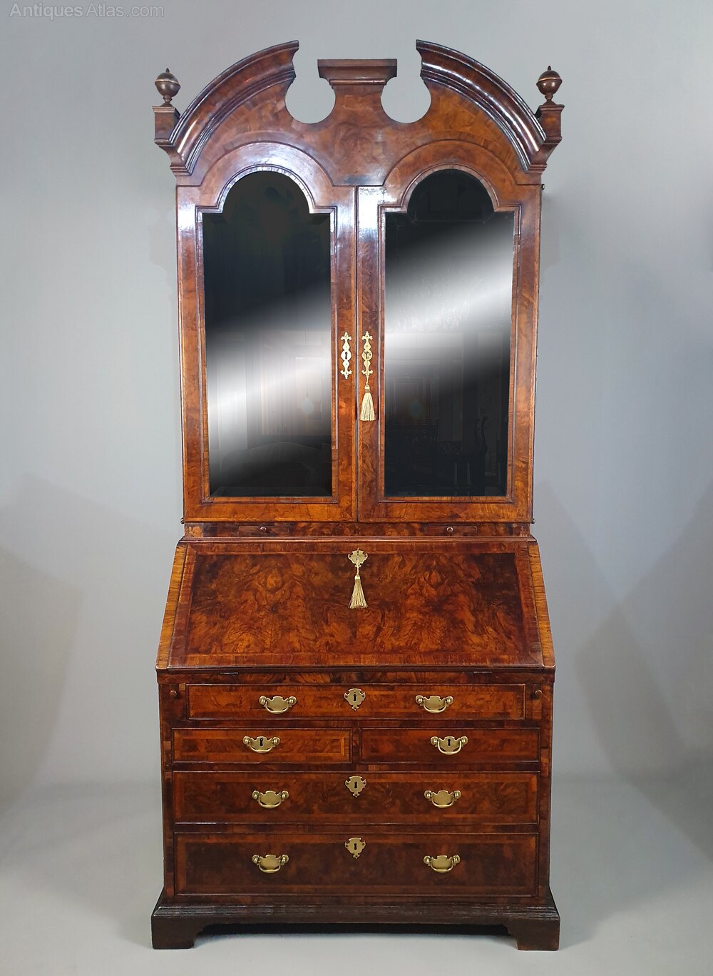 The well shaped doors with featherbanded inlays and crossbanded borders, the fall drawers and pediment with matching featherbanded inlays and crossbanded borders in figured walnut centred with burr walnut panels.