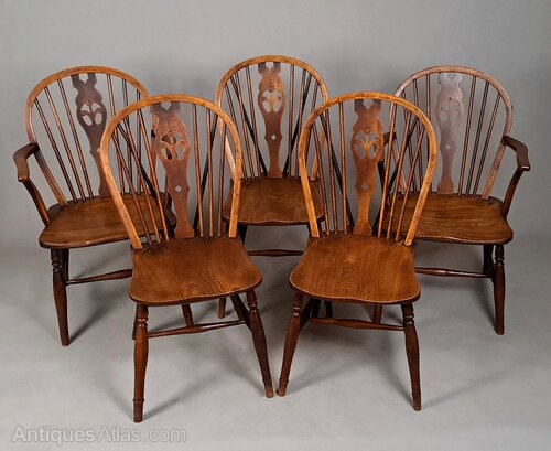 A very good and sturdy set of ash and elm Windsor chairs with a well developed rich nutty colour and good patination and all in excellent robust and original condition.Two carvers and three standards, all with Prince of Wales feathers to the splats and each splat pierced and carved with three delicate roundels.