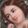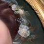 A very beautiful, original and finely detailed oil on canvas of a young woman, her head softly covered with a white silk veil and her plaited hair adorned with wild flowers and roses. She looks back over her shoulder smiling at the painter.The portrait is signed Dumini.