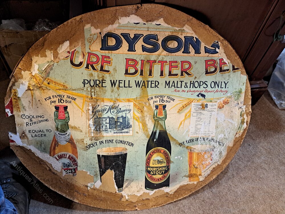 The inner face of the backboard of the frame has part an old advertisement for the George Hotel Brewery in Brighouse – a pub that is still there and now called ‘The George’. The advertisement dates from around 1880 and states that it offers good stabling, pure bitter beer and nourishing stout ‘the beer of our forefathers’.
