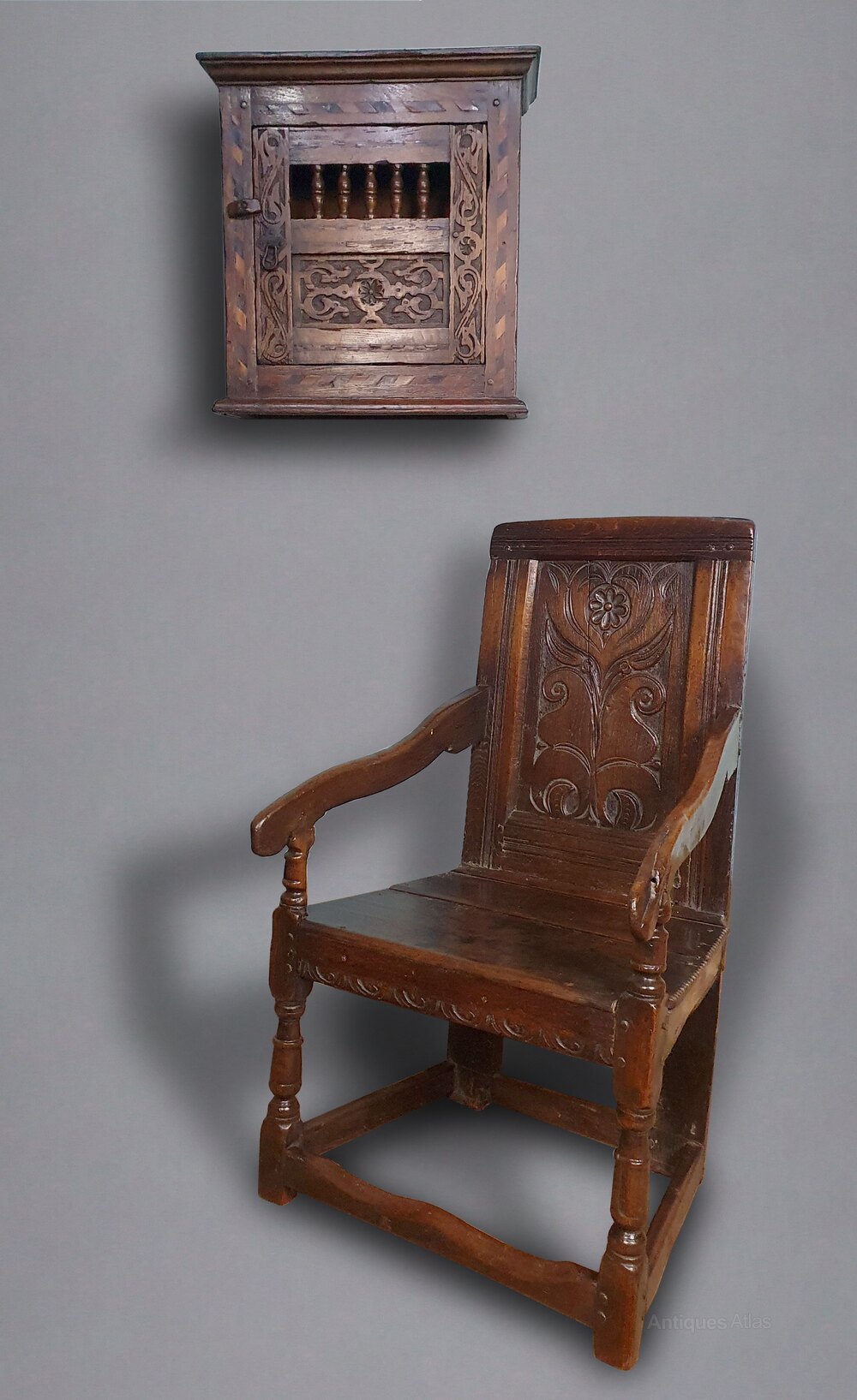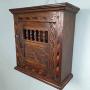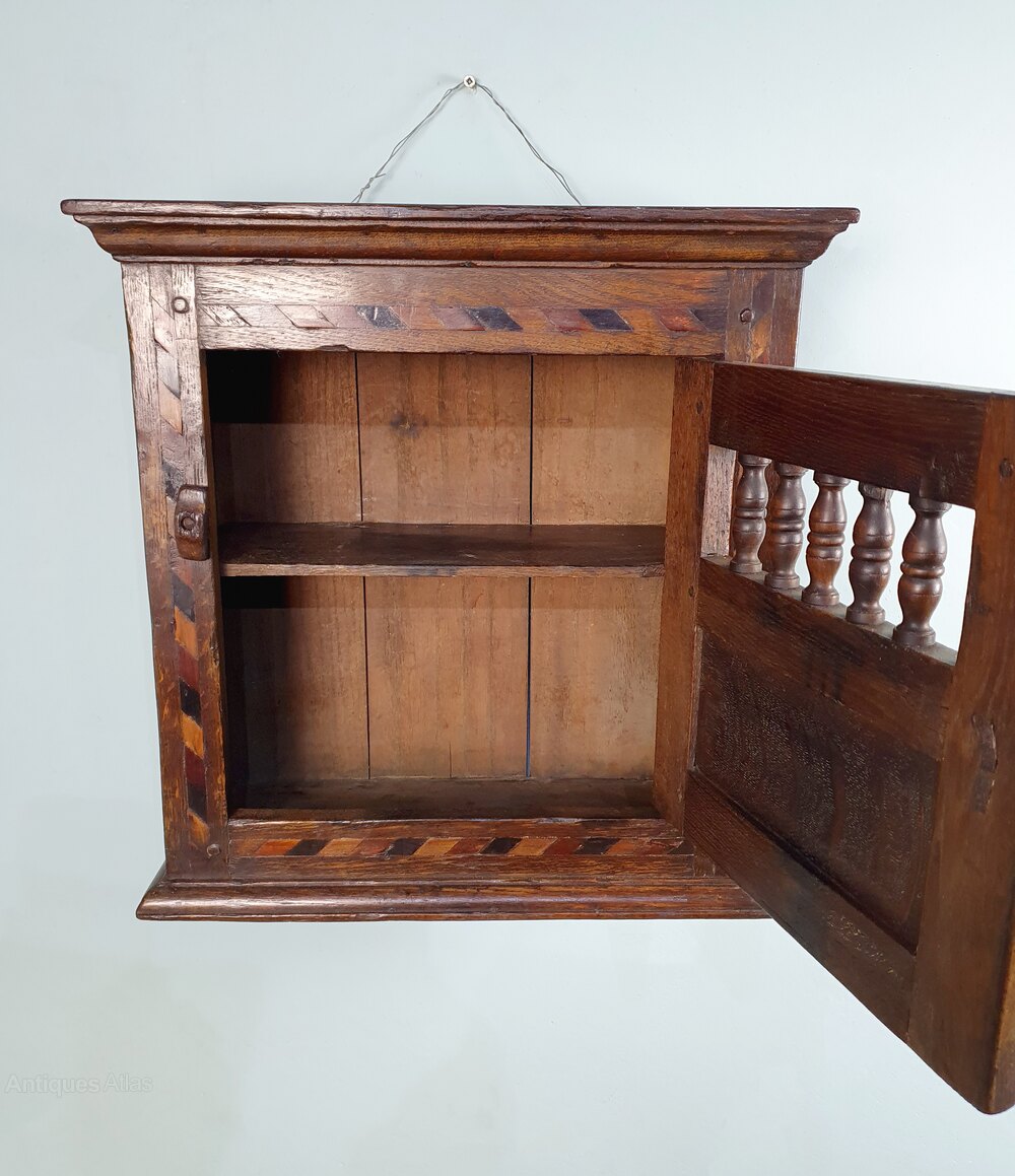 A really lovely small wall hanging cupboard of Queen Anne design with chevron and running band inlays of ebony, walnut and holly, carved foliate S scrolls and beautifully turned spindles with original iron handle and thumb turn lock.In excellent condition throughout, this really looks to have been made in the early 1700s but in my view this was made in around 1850 and is a faithful copy of a Queen Anne livery cupboard, made entirely by hand in solid oak with all the traditional methods of construction, peg jointed and with a lovely colour.