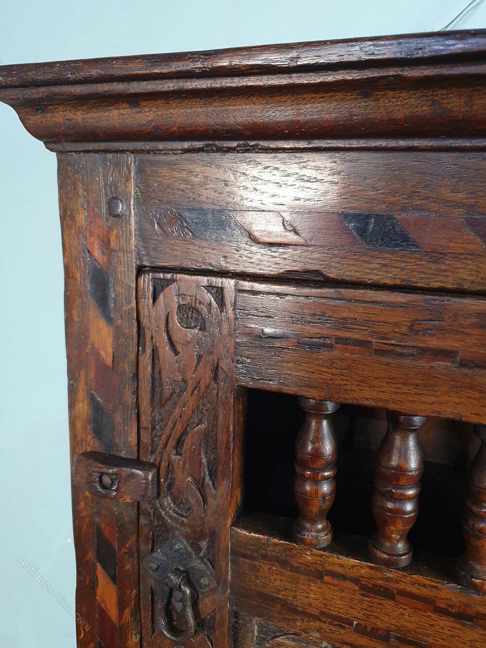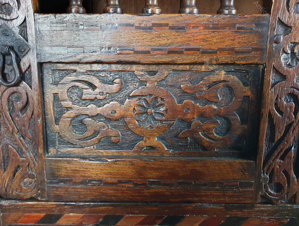 They were often ventilated to keep food cold and fresh and mesh was placed across the ‘window’ behind the spindles to prevent insects and rodents. They were usually built into walls or wall hung and were commonplace in 15th, 16th and early 17th century households although very few still survive. Larger, carved and inlaid cupboards would have served a high status family, smaller cupboards for holding just one or two liveries or rations.