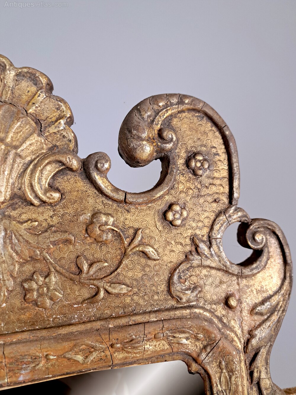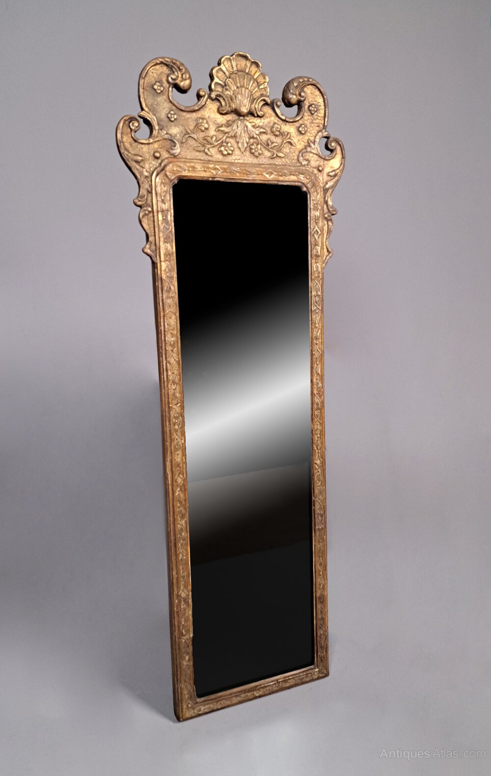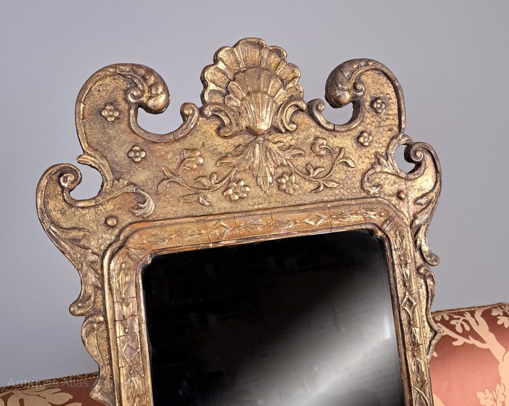 A particularly fine and original George I pier glass with original gilding. The exquisitely shaped arched cresting with central scallop shell and with stylised strapwork and channel carved borders interspersed with flower heads and bell husks.The plate is a later 19th century replacement and is thick hand made glass and reflects well without foxing, degradation or significant marks.