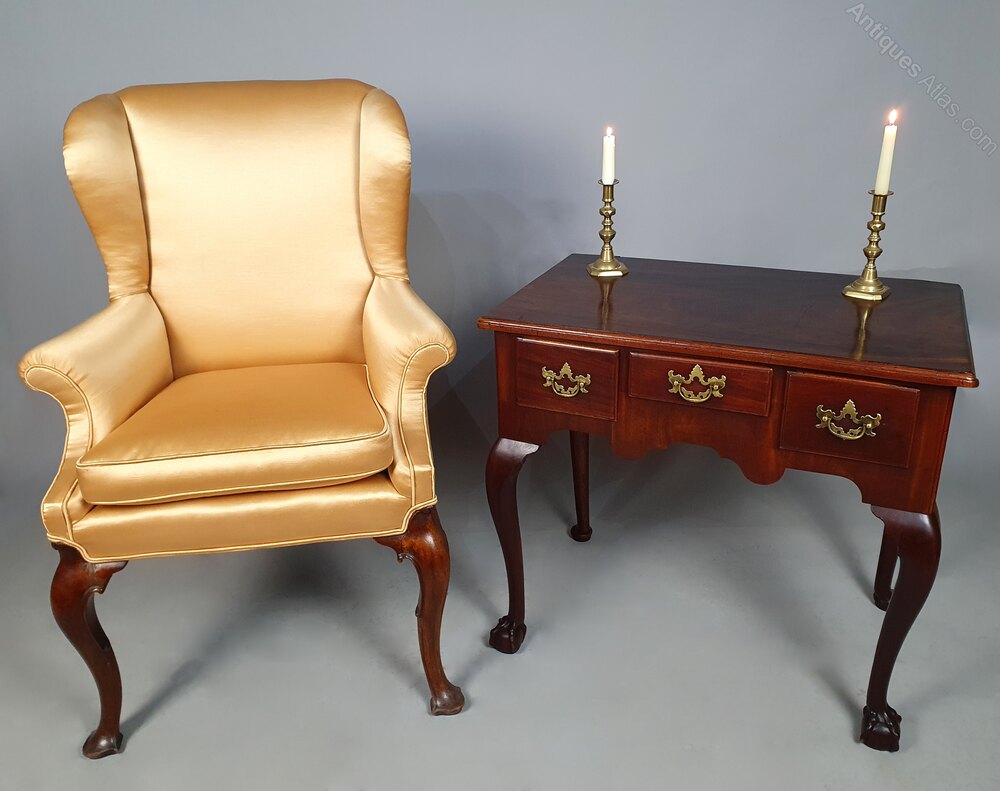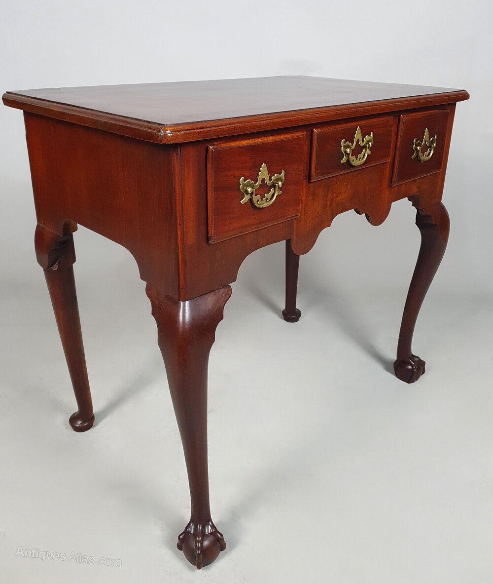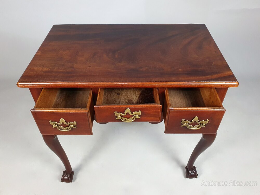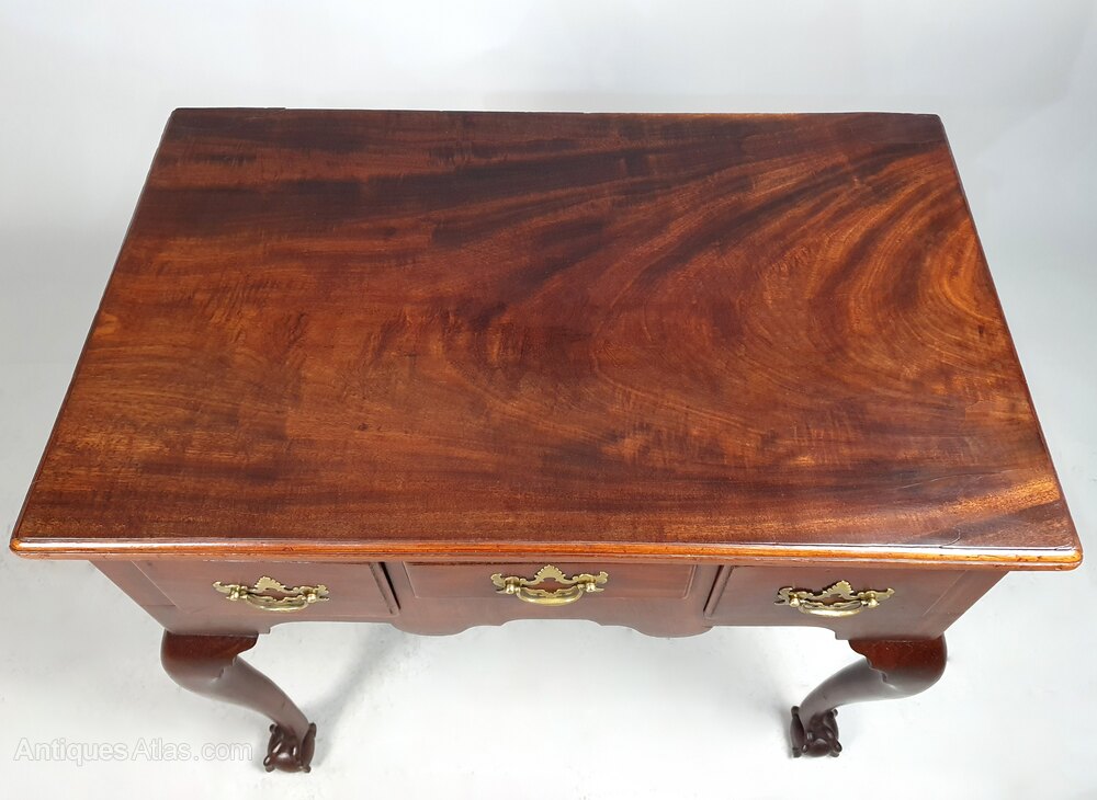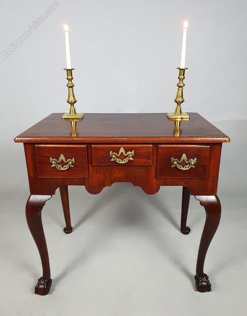 A wonderful small and beautiful red walnut lowboy with three drawers and original brass batswing and bail handles over a well shaped apron and all set on lovely long and elegantly shaped cabriole front legs terminating in substantial and original ball and claw feet.The drawers with solid red walnut fronts with ogee moulded borders and all three are oak lined with original very finely worked boards and tiny hand cut dovetails.