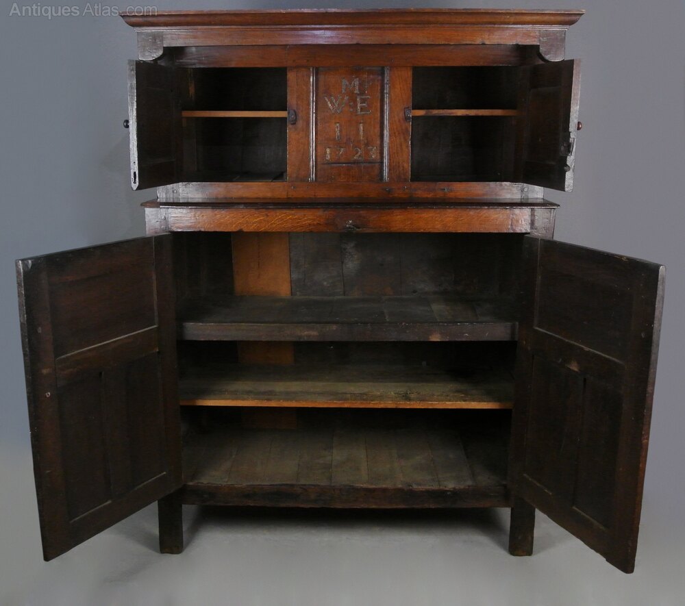 This superior quality and very beautiful English oak press cupboard is of tall and slender proportions and is within its 300th anniversary year.The front panel is carved with the letters M (married) over W:E over I and I – William and Eliza Issacs perhaps, and with the date of marriage 1723. The letters and date still infilled with traces of the original creamy white pigment which would have stood out very boldly when the panel was originally completed.
