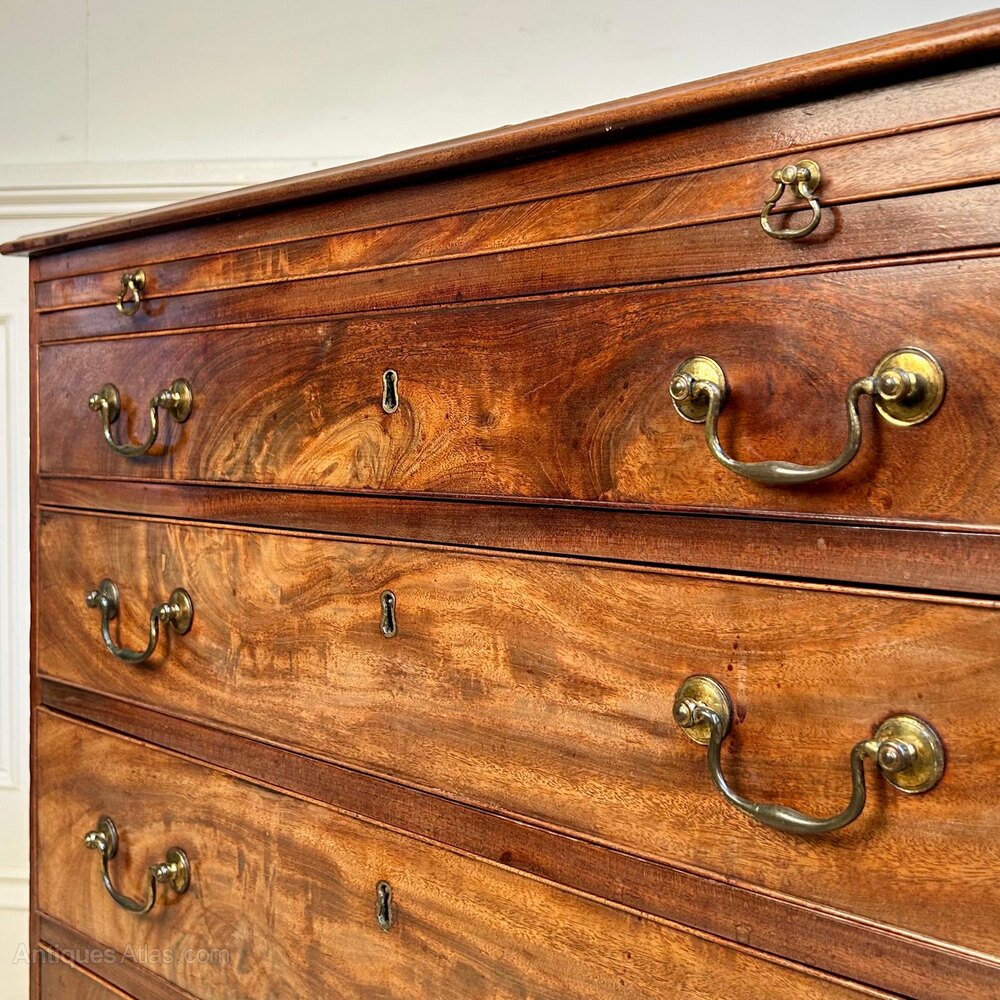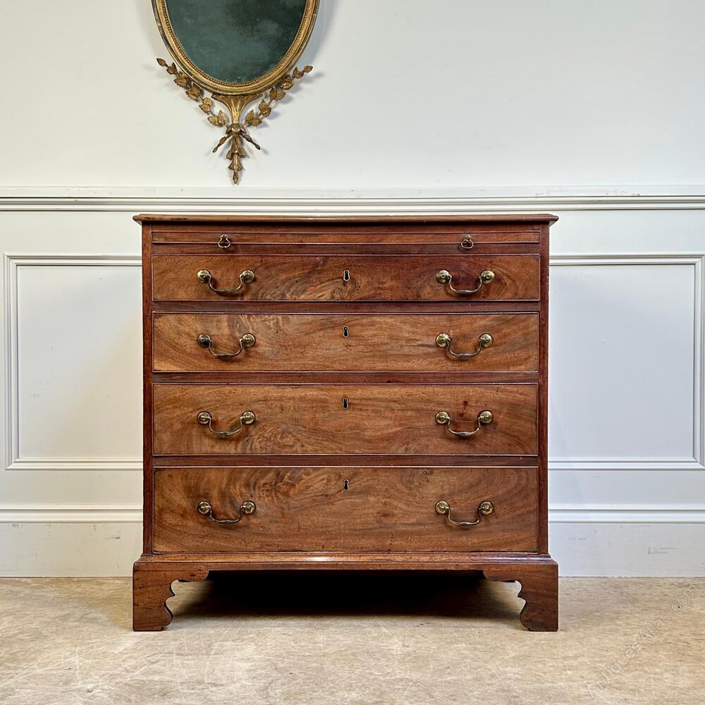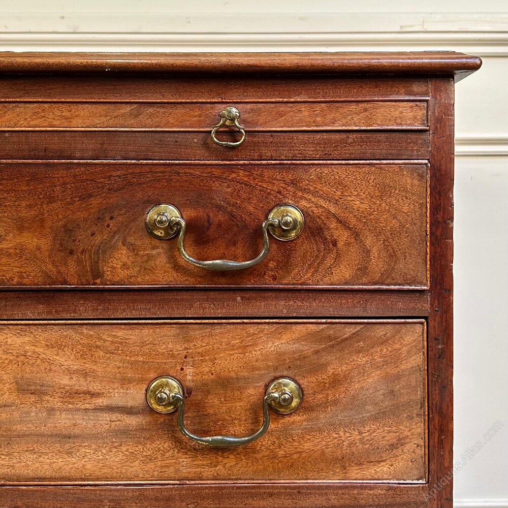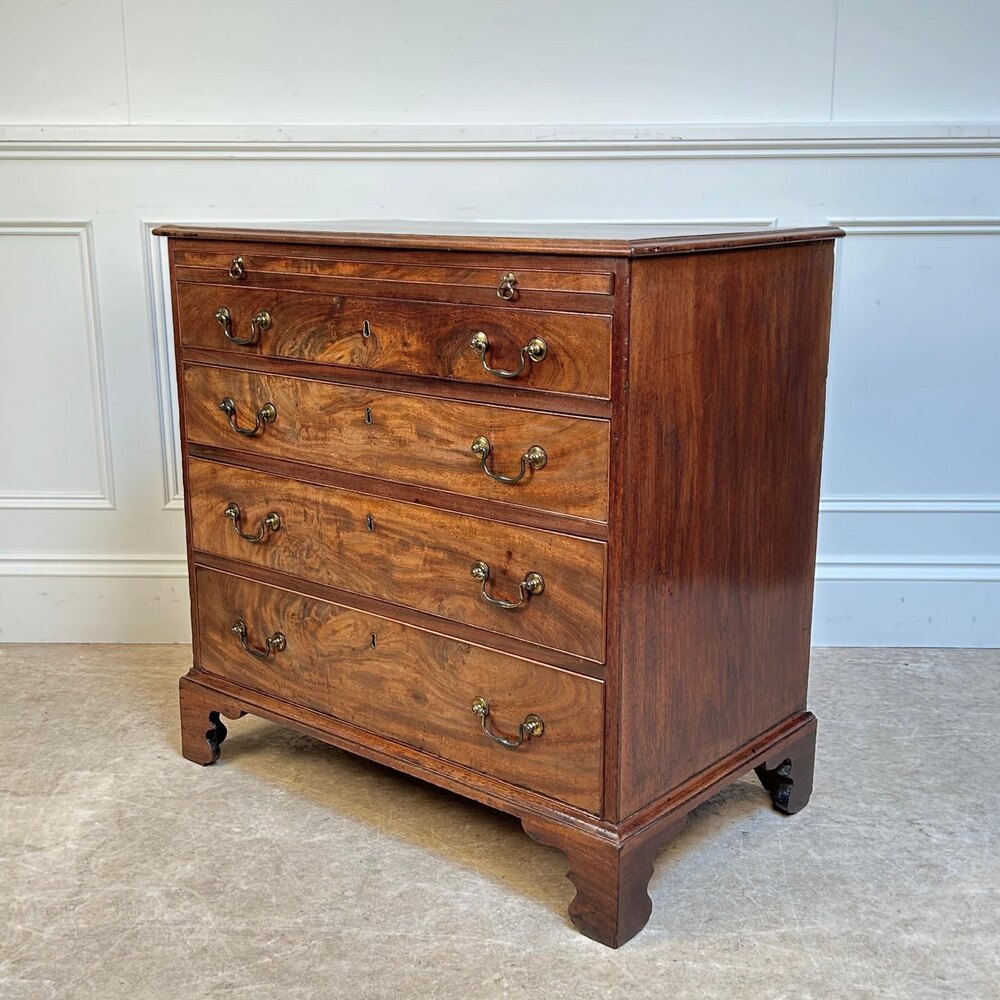 A George III mahogany bachelors chest with a wonderful original finish. This small and well proportioned chest with a brushing slide and having an arrangement of 4 graduated drawers, all beautifully oak lined and retaining the original, locks, handles and escutcheons. The moulded top cross-banded with boxwood line inlay, the whole raised on shaped bracket feet. Super colour with wonderful timber throughout. English, late 18th century.Dimensions: Height: 77.5 cm - 30 1/2 Inches, Width: 78.75 cm - 31 Inches, Depth: 45.75 cm - 18 Inches