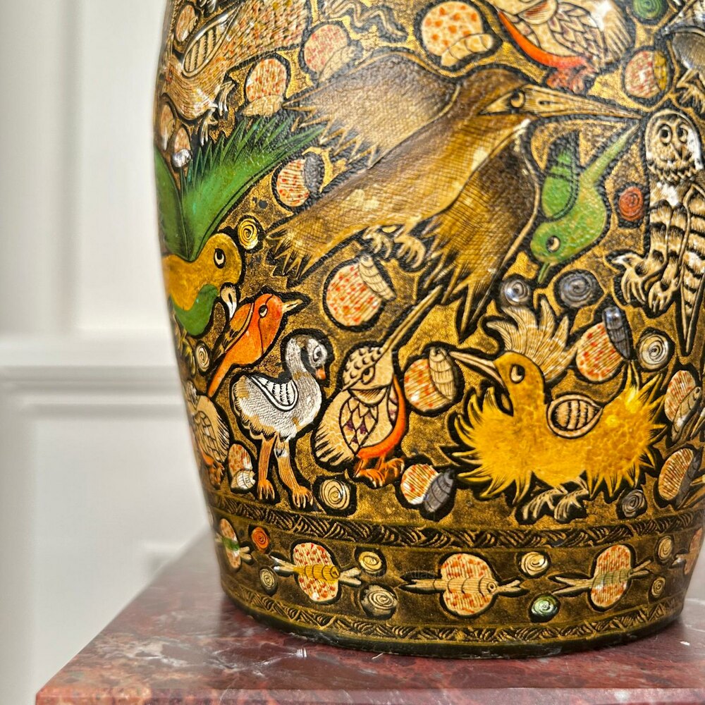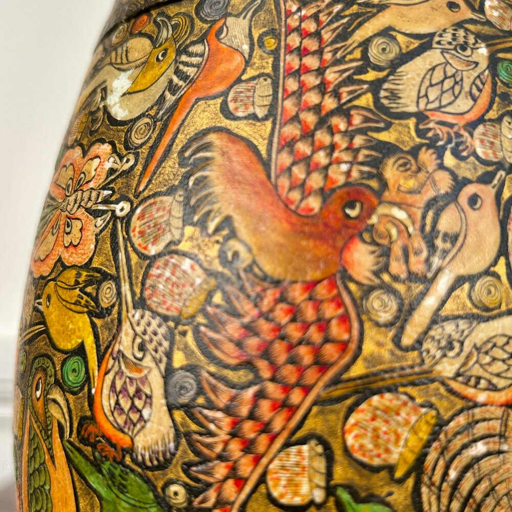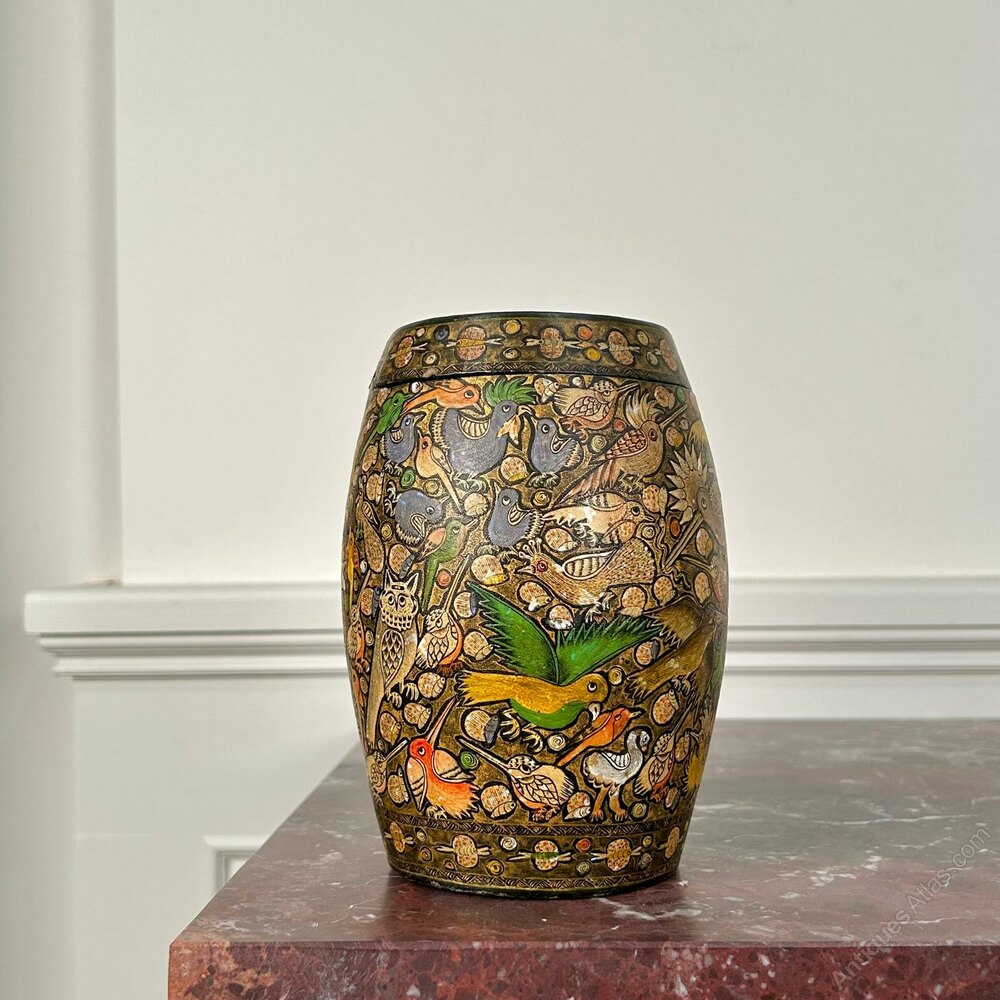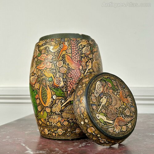 An early 20th century lidded pot which is profusely decorated with hand painted exotic birds. Retaining the original finish with a striking colourway. Indian, Circa 1910.Dimensions: Height: 17.25 cm - 6 3/4 Inches, Width: 12 cm - 4 3/4 Inches, Depth: 12 cm - 4 3/4 Inches
