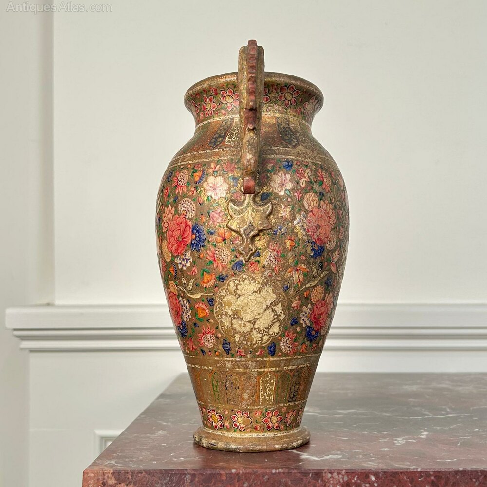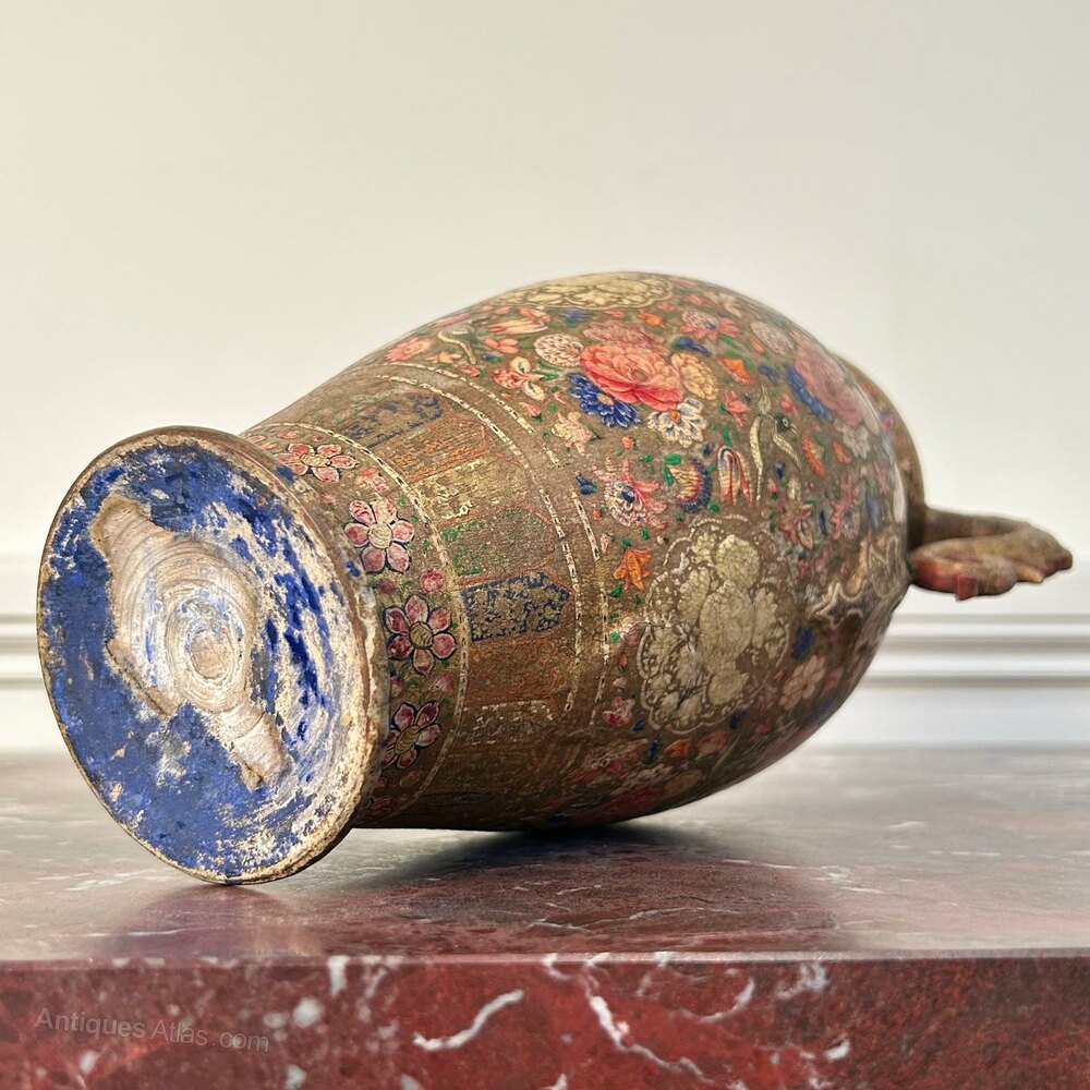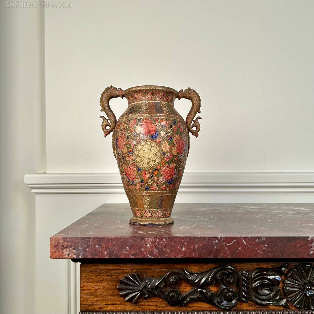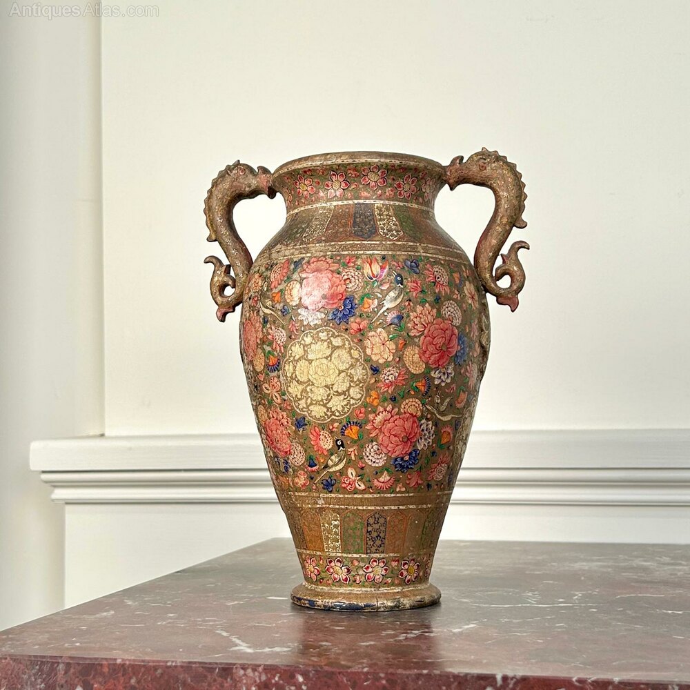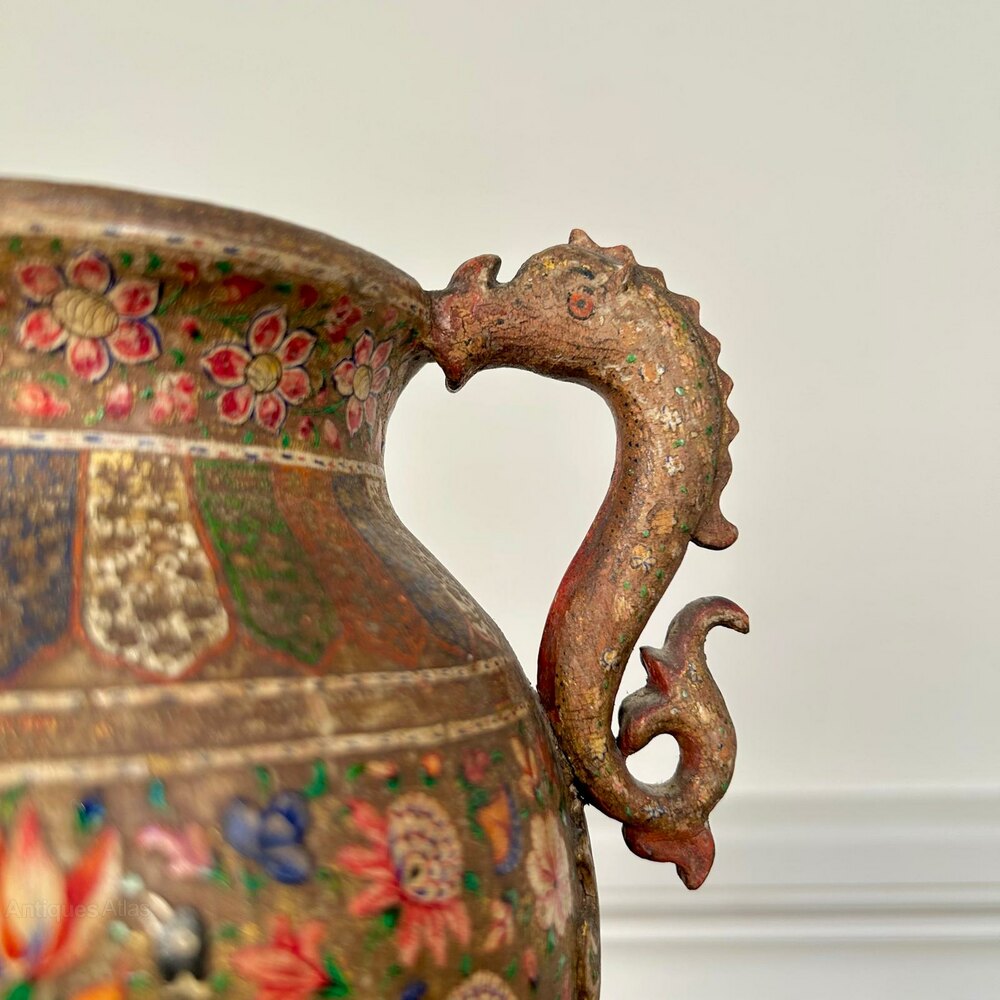 A beautiful late 19th century Kashmiri vase with lovely Seahorse handles. Retaining the original hand painted decoration depicting flowers and birds. Indian, Circa 1890.Dimensions: 23.5 cm - 9 1/4 Inches, Width: 18.5 cm - 7 1/4 Inches, Depth: 12.75 cm - 5 Inches