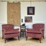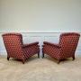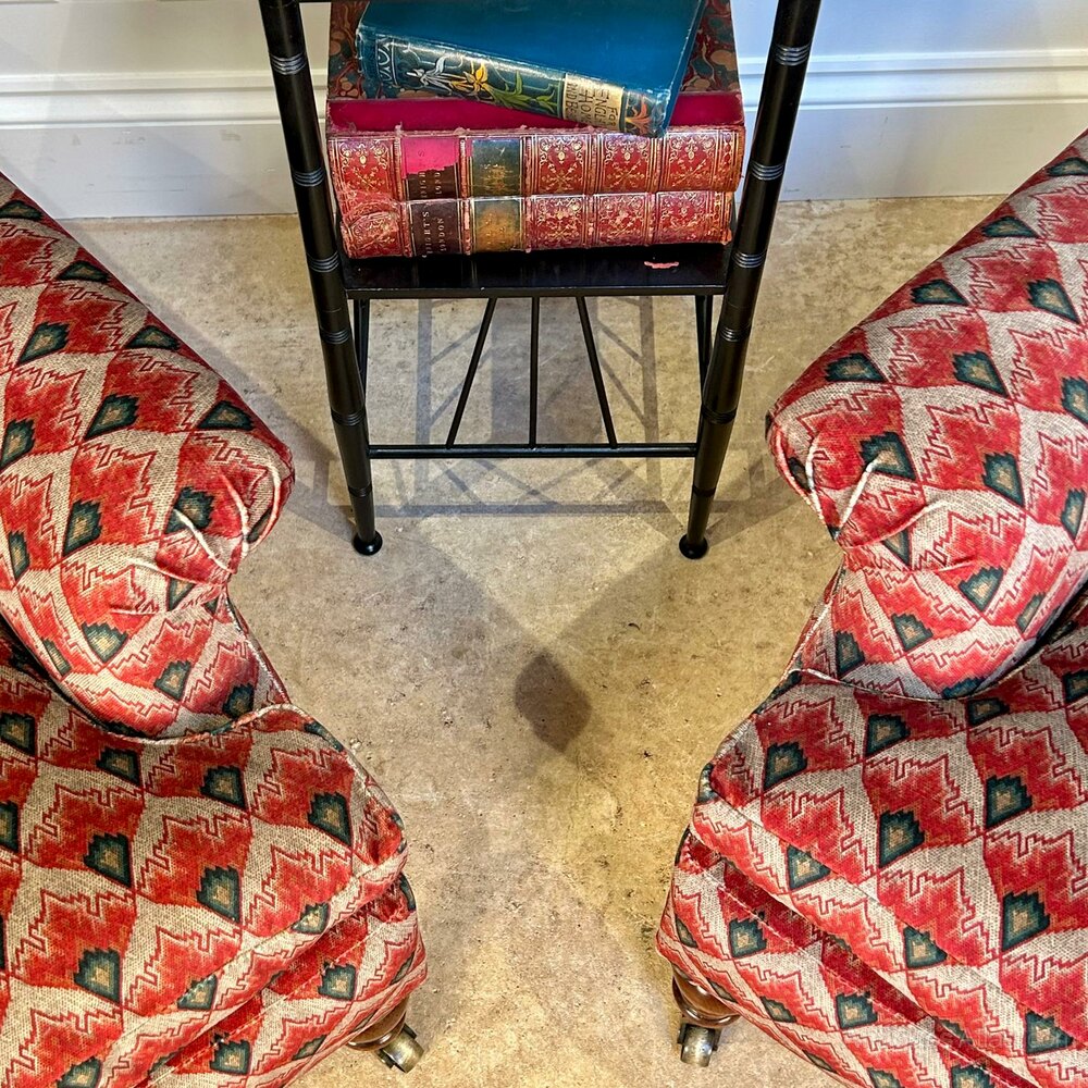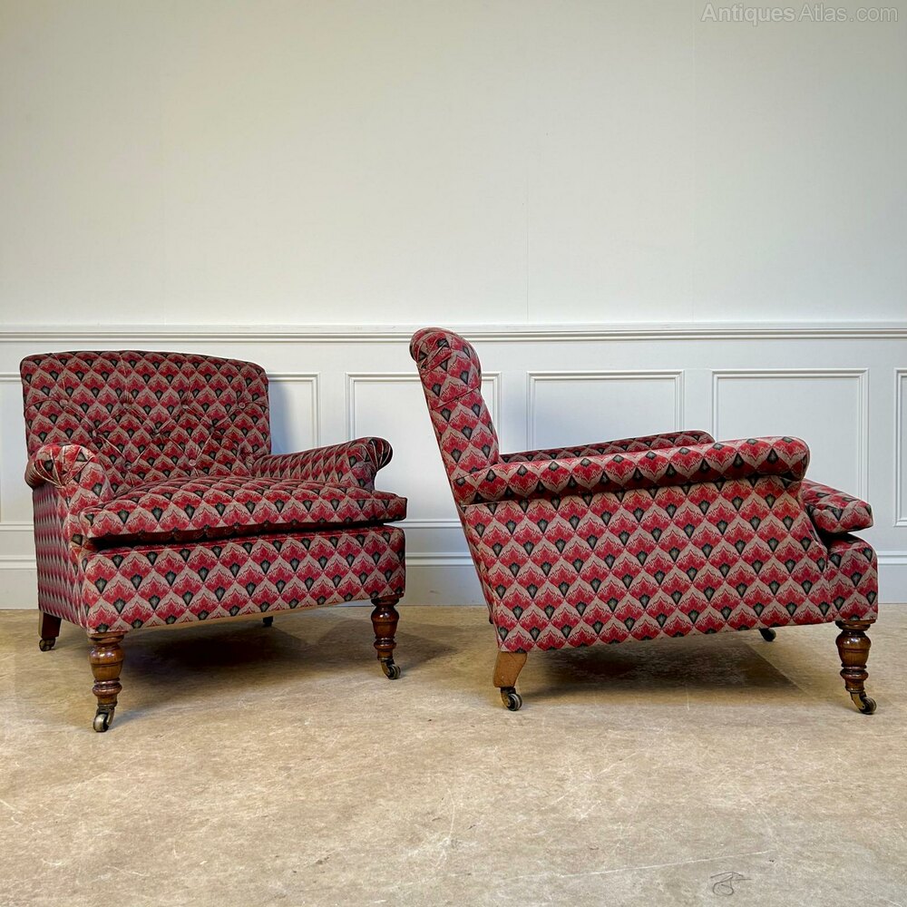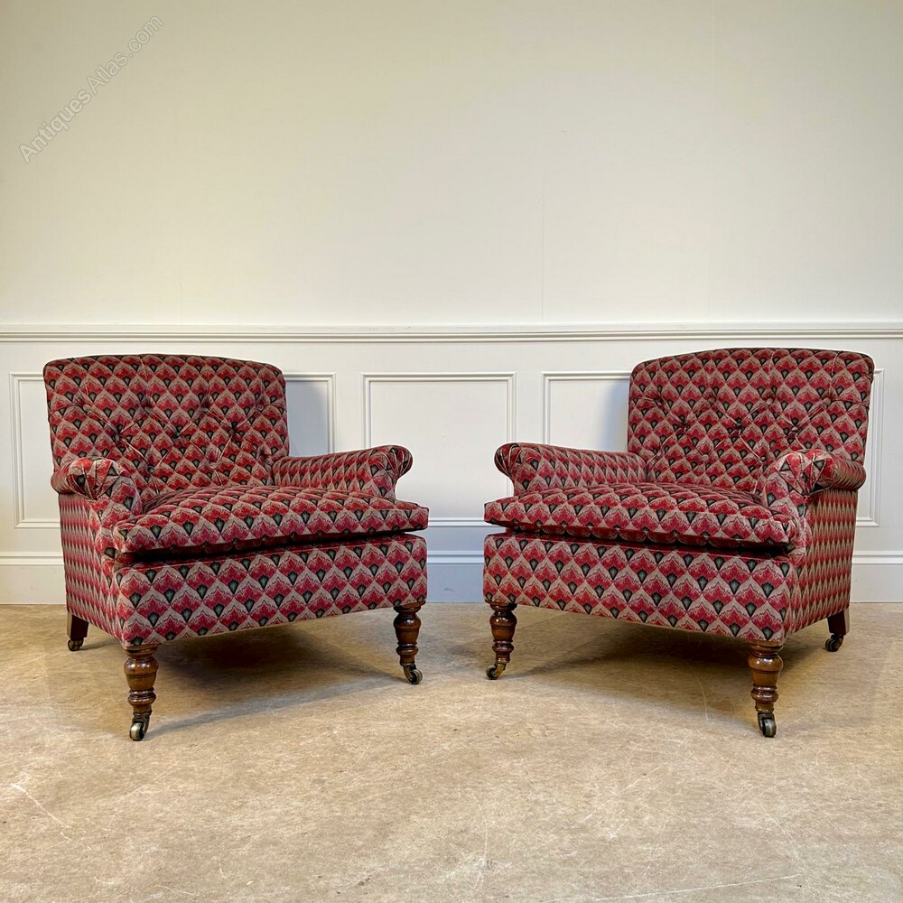 A pair of Gillows mahogany armchairs of country house proportions. These rare pair of deep seated chairs having a sprung button back and sprung seat with original down feather seat cushions. Raised on mahogany turned front legs with strong splayed back legs with original gilt lacquered brass castors. Superb condition throughout, retaining horsehair and newly re-upholstered in the beautiful Guy Tobin "Cinder" velvet. Stamped English, Circa 1870.Dimensions: Height: 82.5 cm - 32 1/2", Width: 83.75 cm - 33 Inches, Depth: 97.75 cm - 38 1/2 Inches