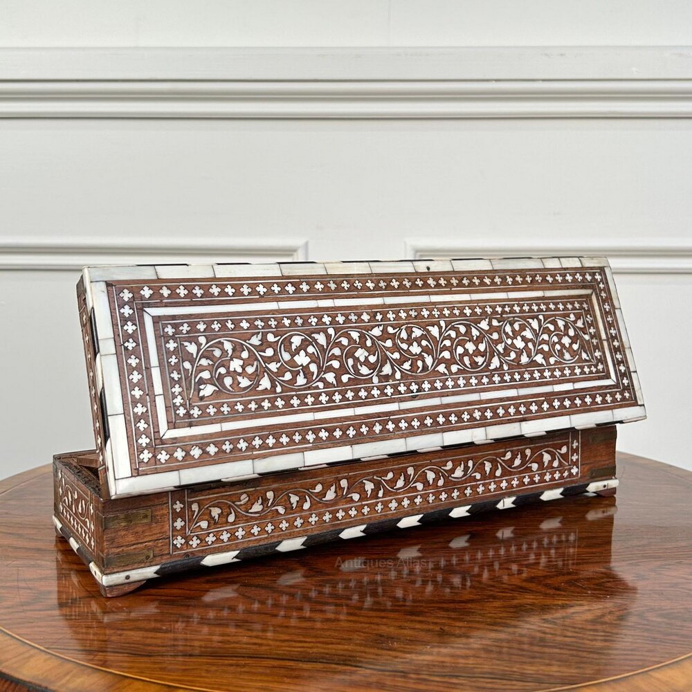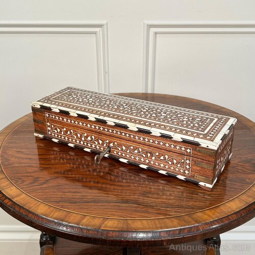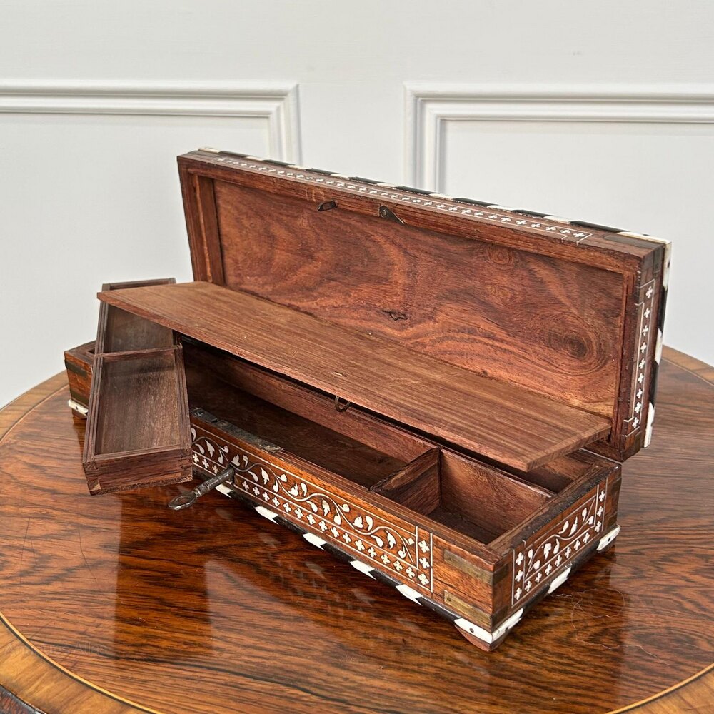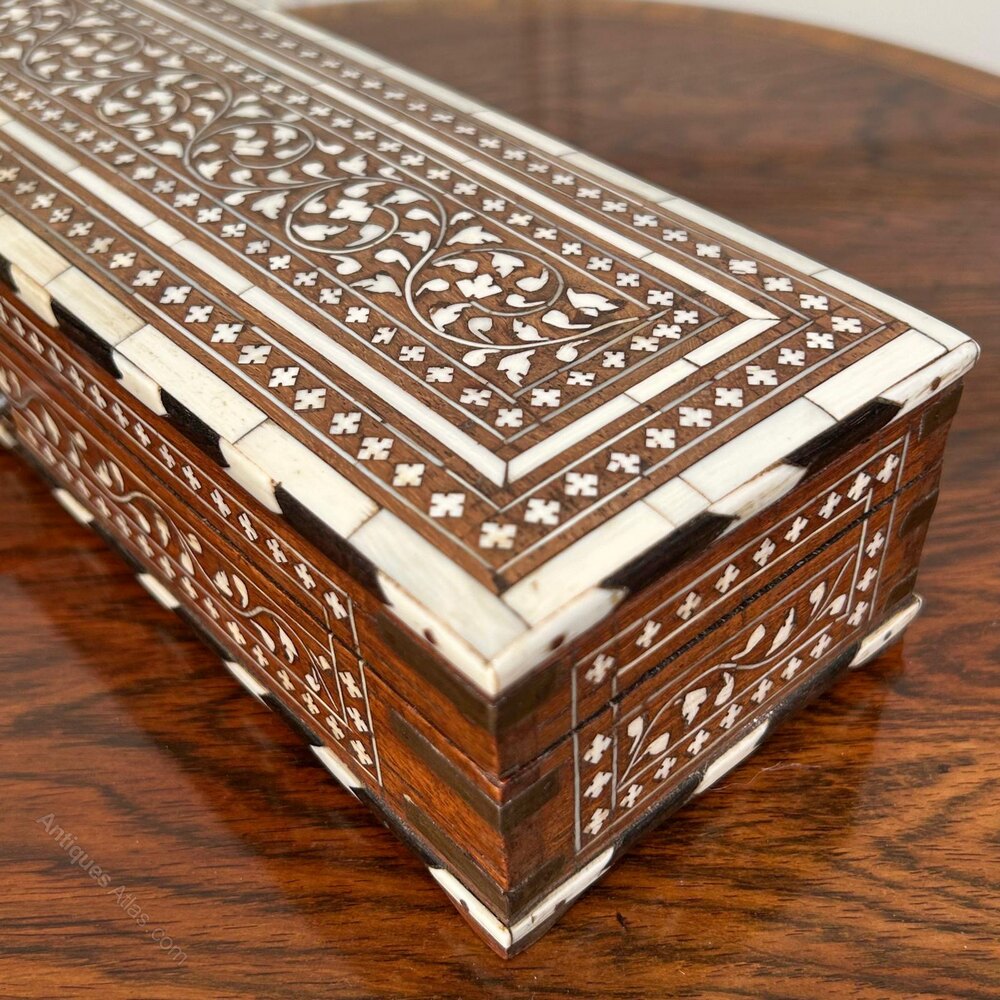 A beautiful Hoshiarpur artists / writing box in wonderful original condition throughout. Inlaid profusely in bone and ebony with exceptionally good colour. The box opens to reveal a compartmented interior with original lock and key. Indian, Circa 1900.Dimensions: Height: 6.5 cm - 2 1/2 Inches, Width: 30 cm - 11 3/4 Inches, Depth: 9.5 cm - 3 3/4 Inches