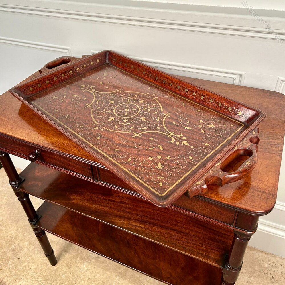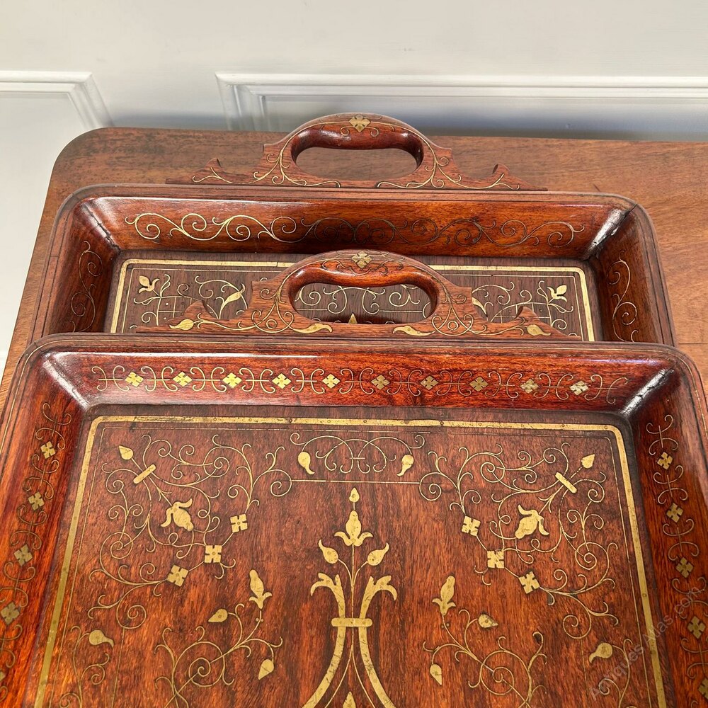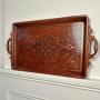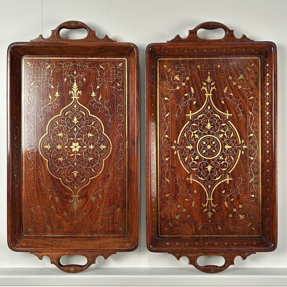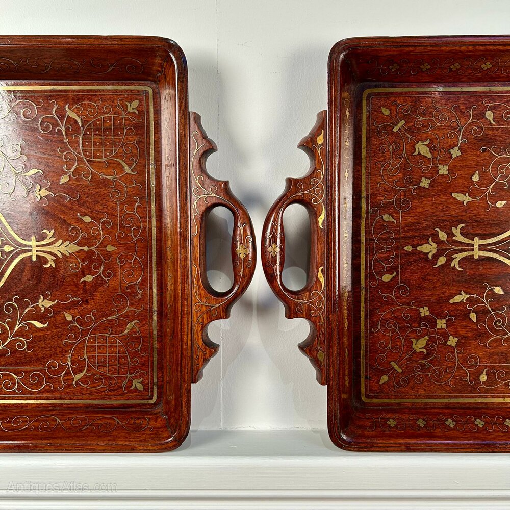 One of 2 available.A beautiful Hoshiarpur tray in super condition throughout. Having intricate brass inlaid decoration throughout with carved handles. Retaining its original finish with a rich patina and colour. Indian, Circa 1900.